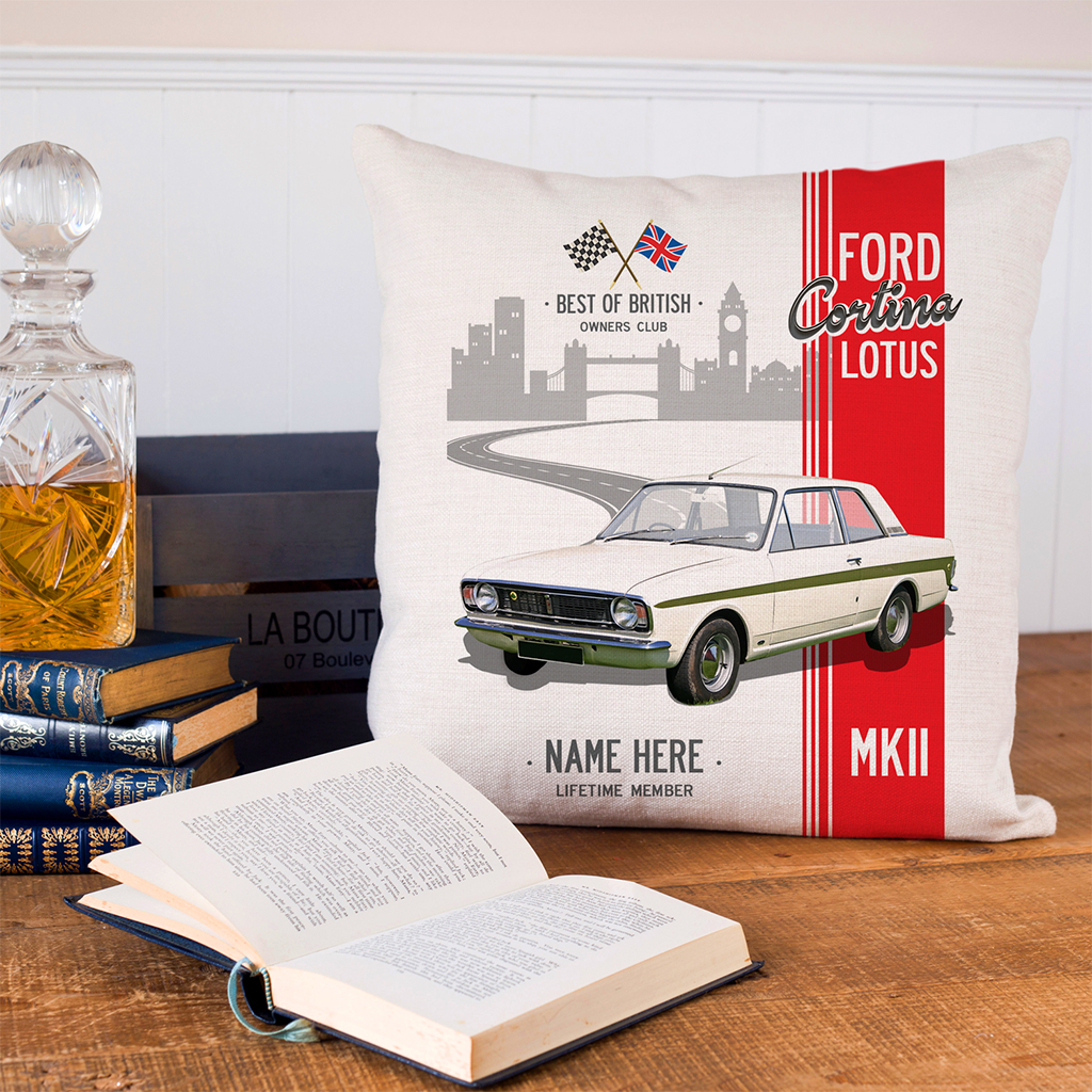 Our personalised Ford Cortina MKII Lotus cushion covers are the perfect gift for any occasion including birthdays and retirement. The classic car inspired throw pillows are the ideal gift for Father’s Day, for Dad, Grandad or Uncle.