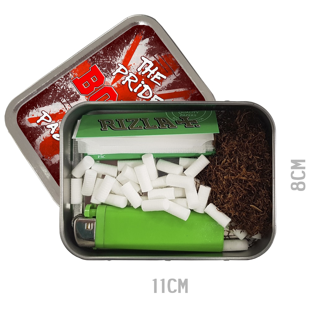 Keep ciggy papers, filters and loose baccy fresh in this custom retro casual football tin.