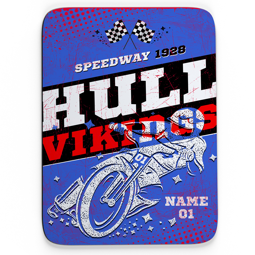 This personalised Hull Vikings speedway mouse mat is the perfect gift for every motorcycle speedway fan! Support your favourite bike team with pride while brightening up the office. Each mouse mat can be personalised with a name and rider number for that extra special touch. With a rubber non-slip backing, this is a unique and practical gift for every speedway lover!