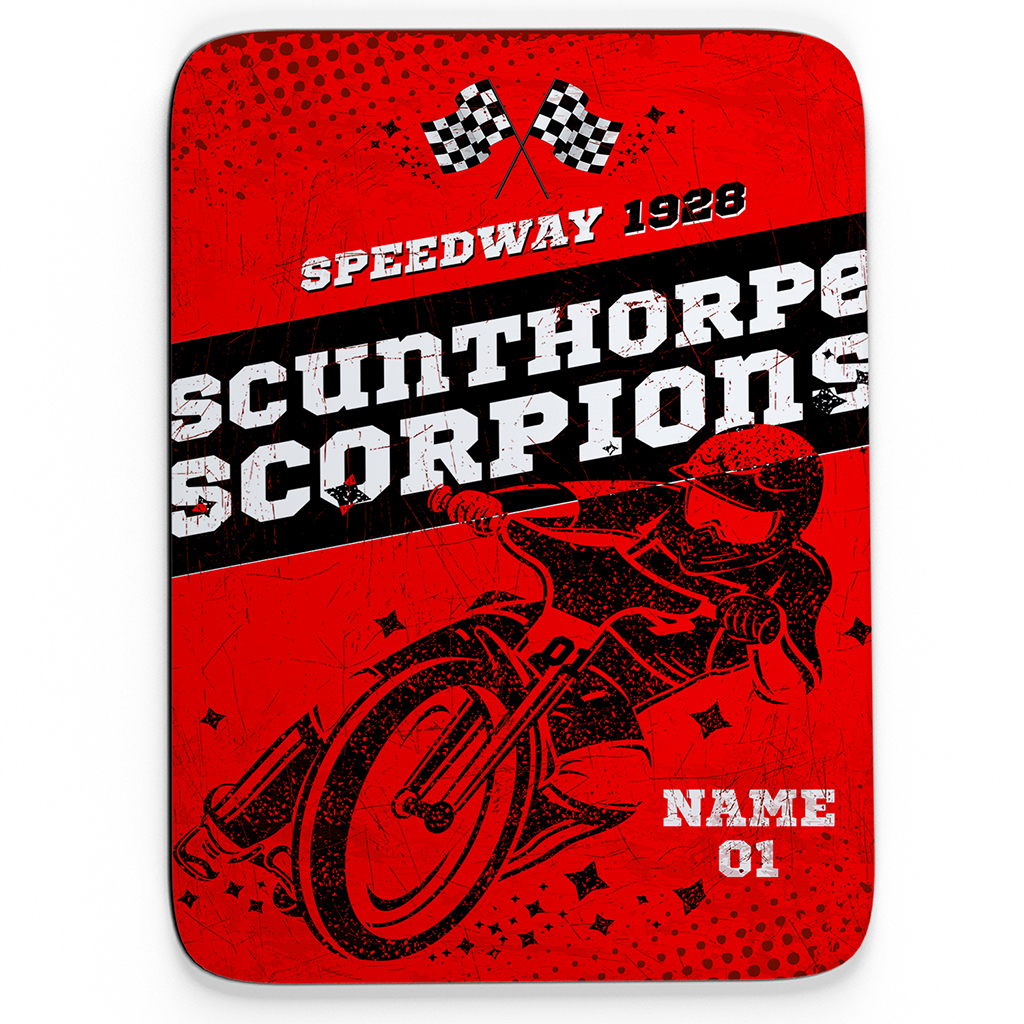 This personalised Scunthorpe Scorpions speedway mouse mat is the perfect gift for every motorcycle speedway fan! Support your favourite bike team with pride while brightening up the office. Each mouse mat can be personalised with a name and rider number for that extra special touch. With a rubber non-slip backing, this is a unique and practical gift for every speedway lover!