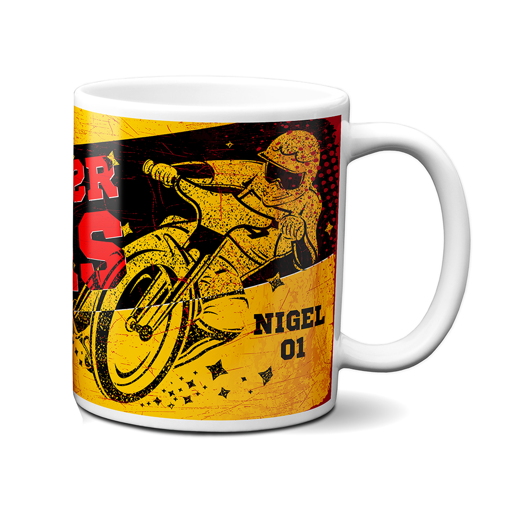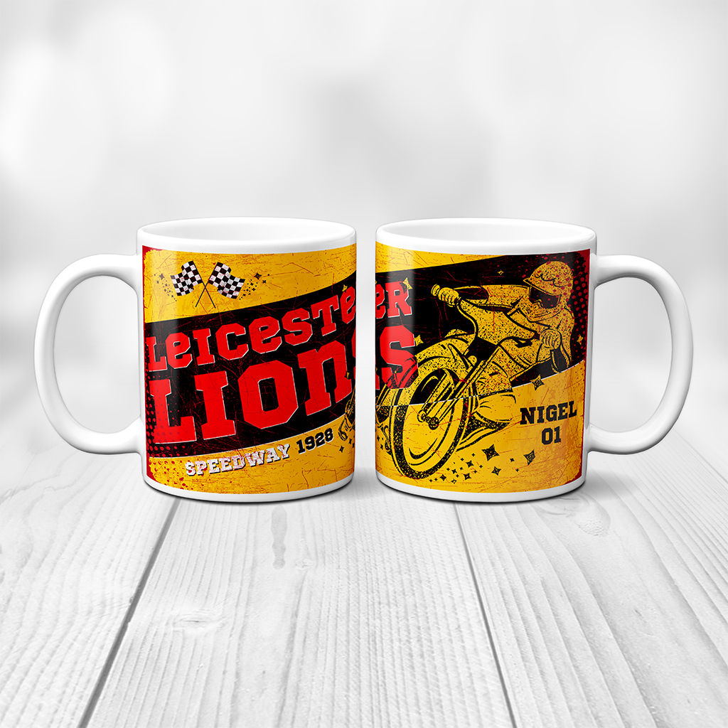 This personalised Leicester Lions speedway mug is the perfect gift for every motorcycle speedway fan! Support your favourite bike team with pride while enjoying your tea and coffee. Each mug can be personalised with a name and rider number for that extra special touch. This is a unique and practical gift for every speedway lover, sure to brighten up the kitchen or office.