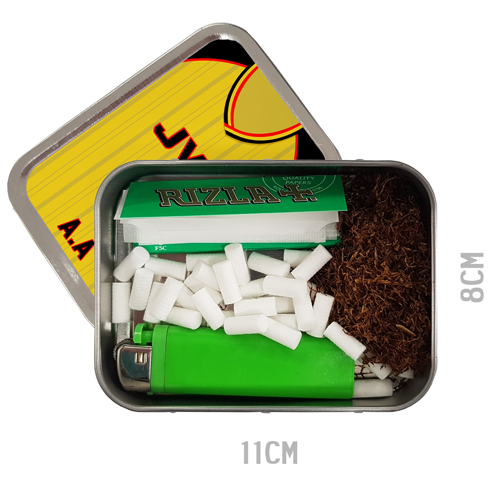 Keep ciggy papers, filters and loose baccy fresh in this custom retro casual football tin.