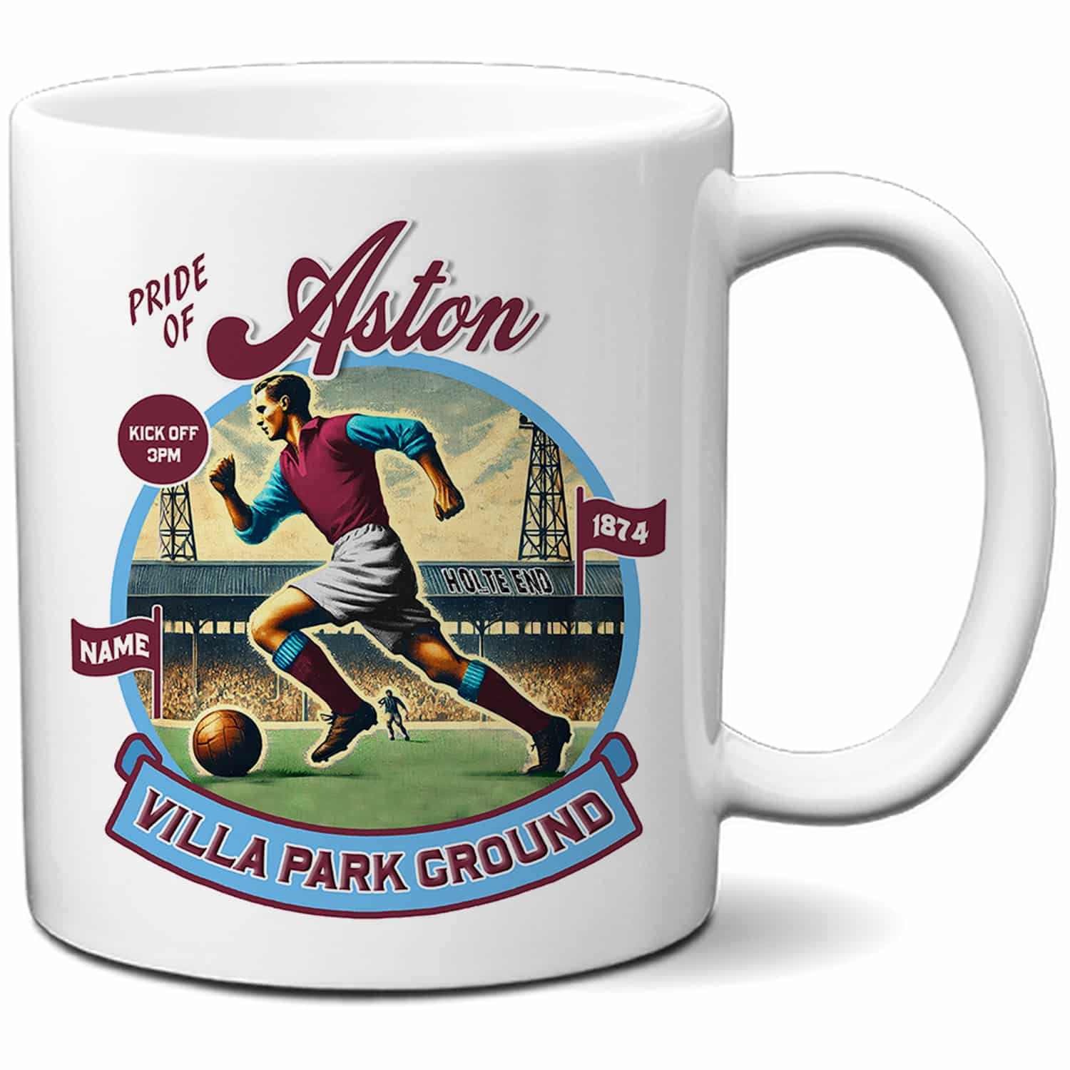 Personalised Aston Villa Football Nostalgia Mug, the perfect gift for any football fan. These custom tea / coffee cups are ideal birthday gifts and Christmas stocking fillers. Any name can be printed on to the mug, making it a beautiful keepsake for any retro football fan. A great gift for retirement.