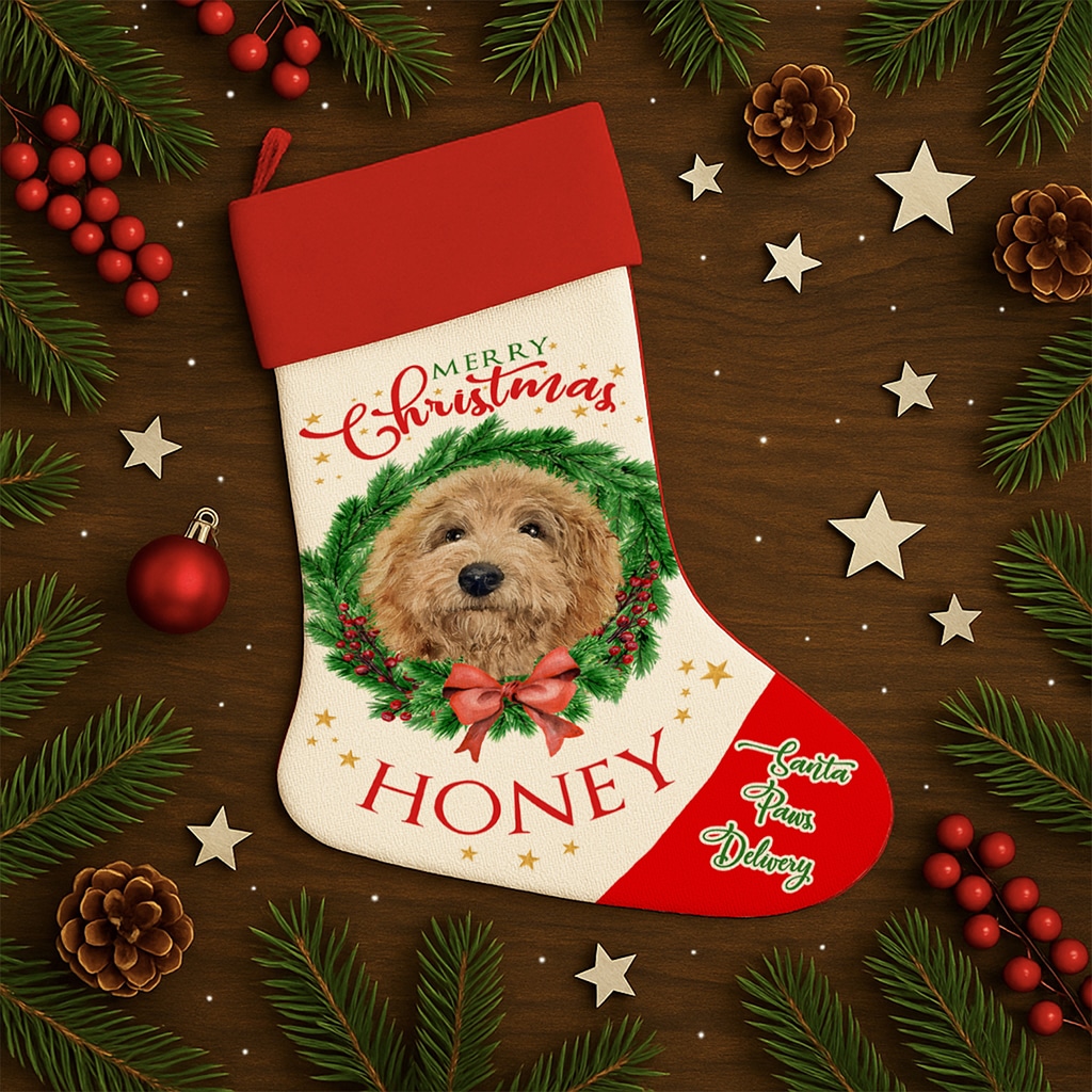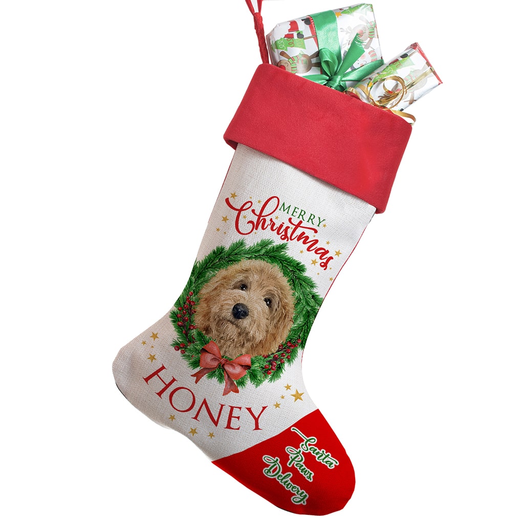 Personalised Blonde Doodle Dog Christmas Stocking — great seasonal decor and perfect to hold festive treats for your furry friend!