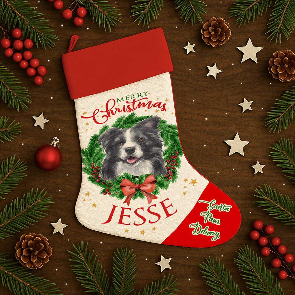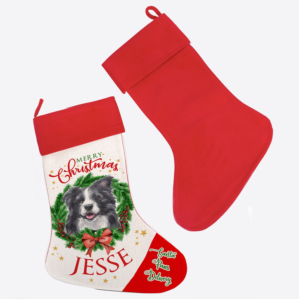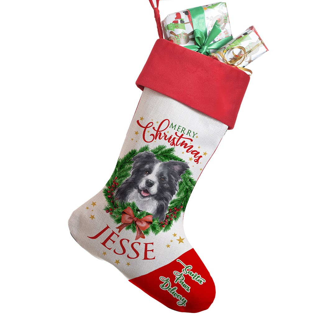 Personalised Border Collie Dog Christmas Stocking — great seasonal decor and perfect to hold festive treats for your furry friend!
