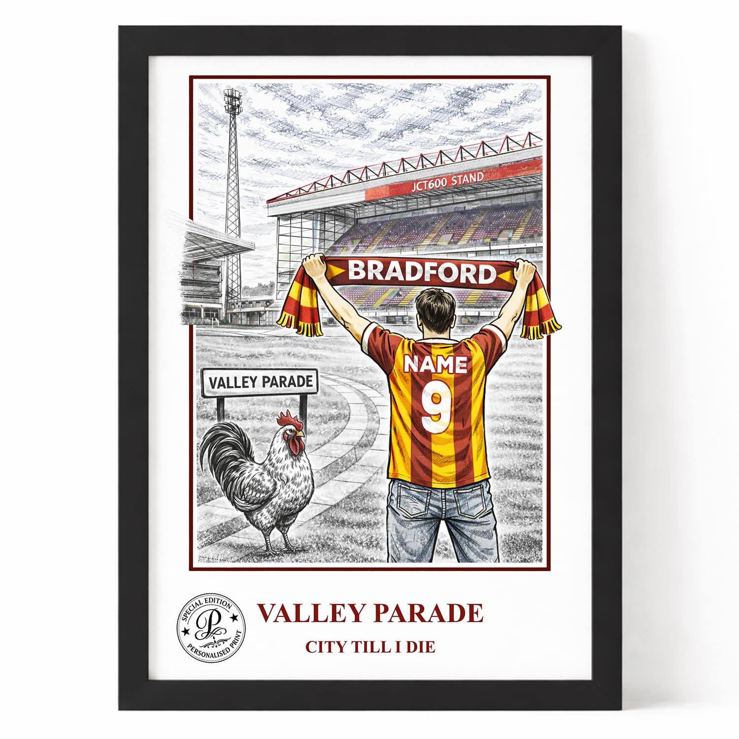 Personalised Bradford Football Stadium Print A3 A4 Framed Unframed Wall Art Gift.