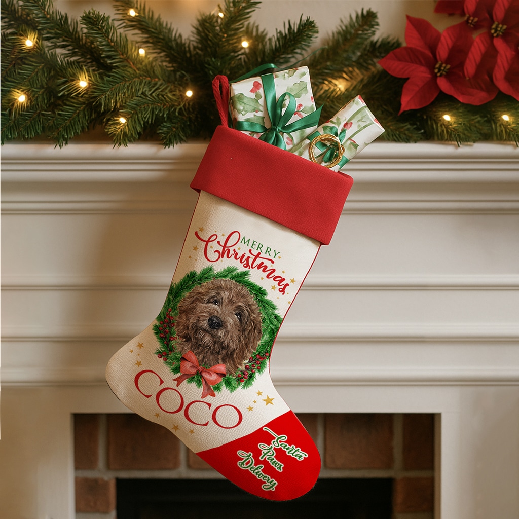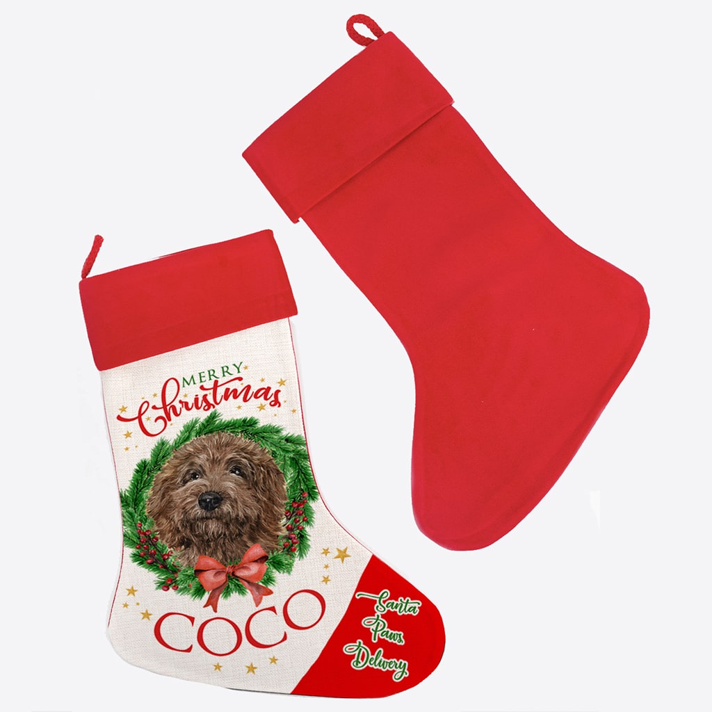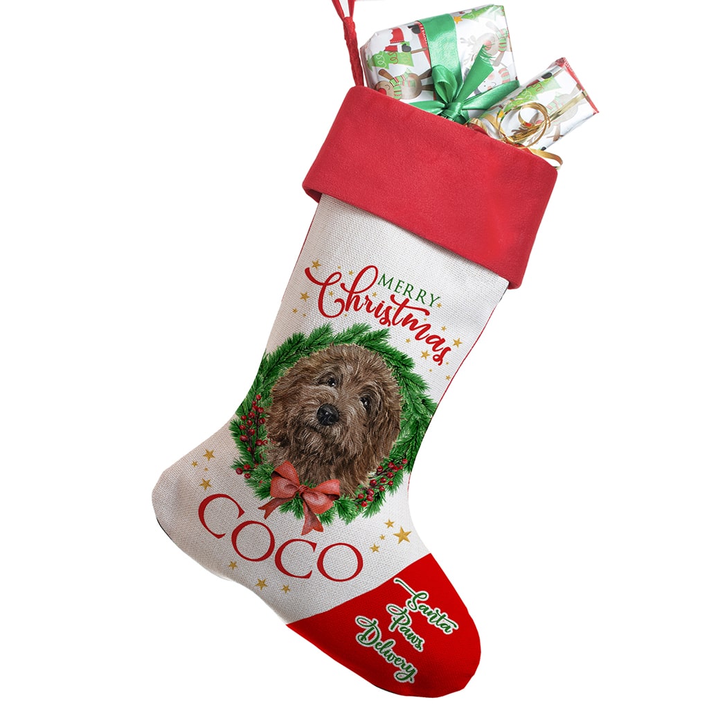 Personalised Brown Doodle Dog Christmas Stocking — great seasonal decor and perfect to hold festive treats for your furry friend!