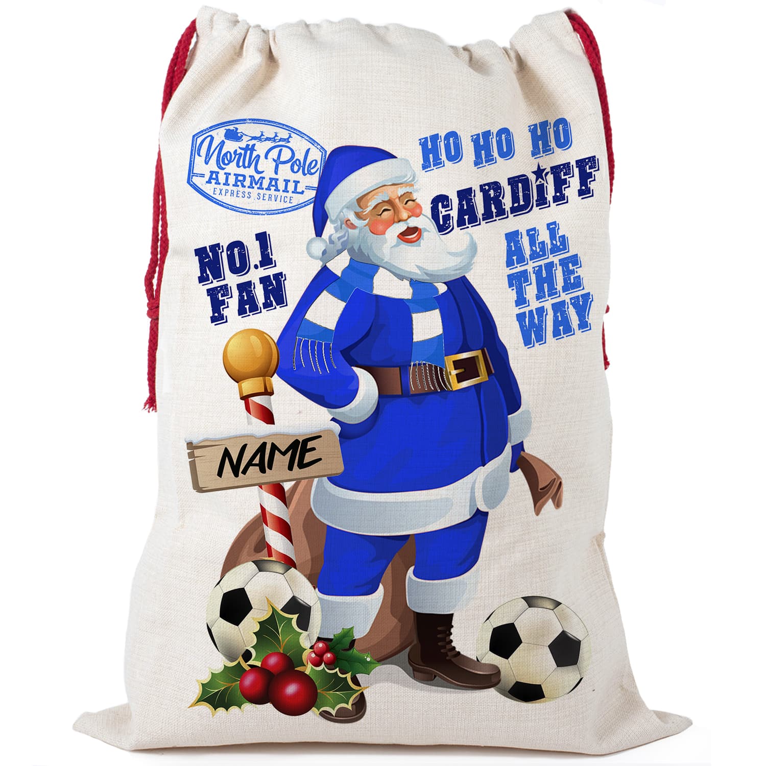 Personalised Cardiff Football Christmas Sack is the ideal gift for any Football Fan. The beautiful sacks with festive red cord are ideal for Xmas day and will make any budding footballers Christmas!