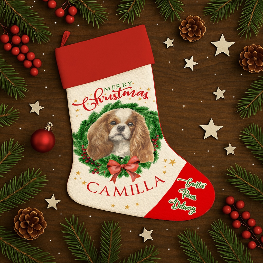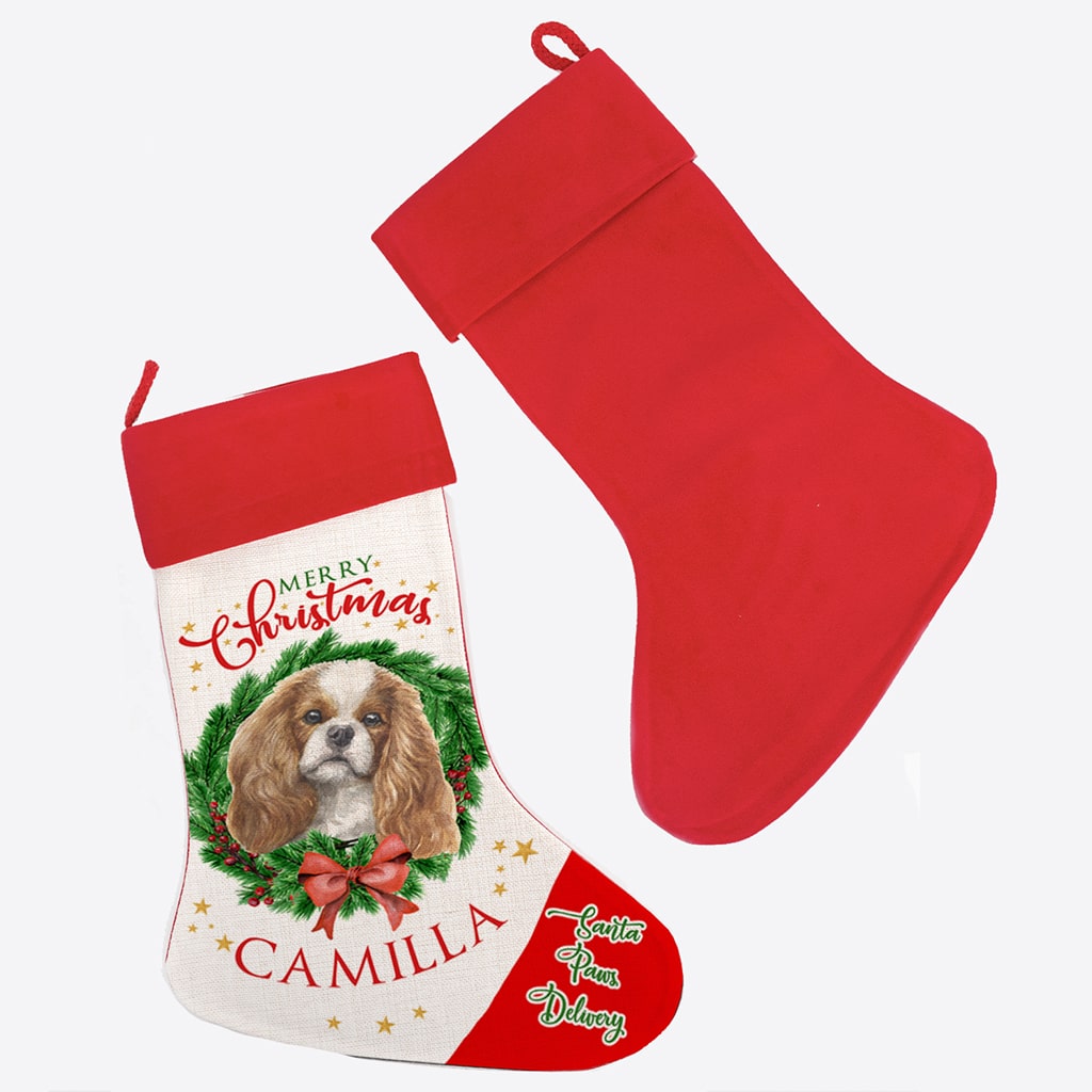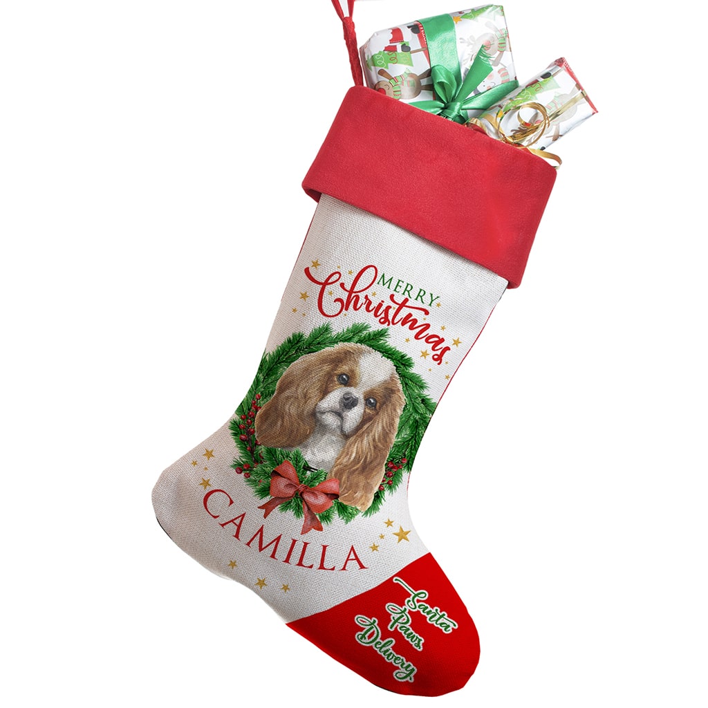 Personalised Cavalier King Charles Spaniel Dog Christmas Stocking — great seasonal decor and perfect to hold festive treats for your furry friend!