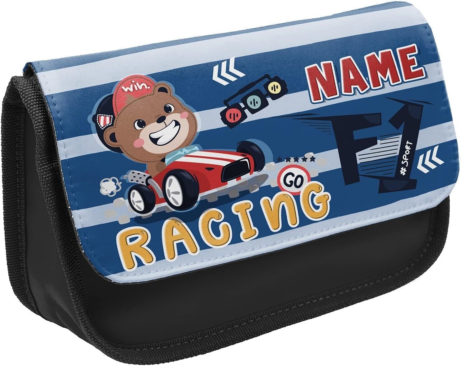 Our personalised racing bear pencil case is ideal to carry all little boys school stationery.