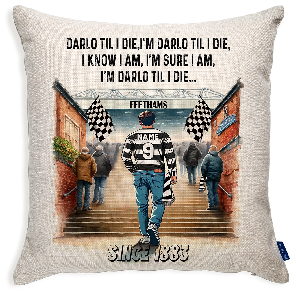 This Personalised Darlington Football Watercolour Stadium Cushion Cover is the perfect match day football fan gift, custom personalised with your name and squad number.