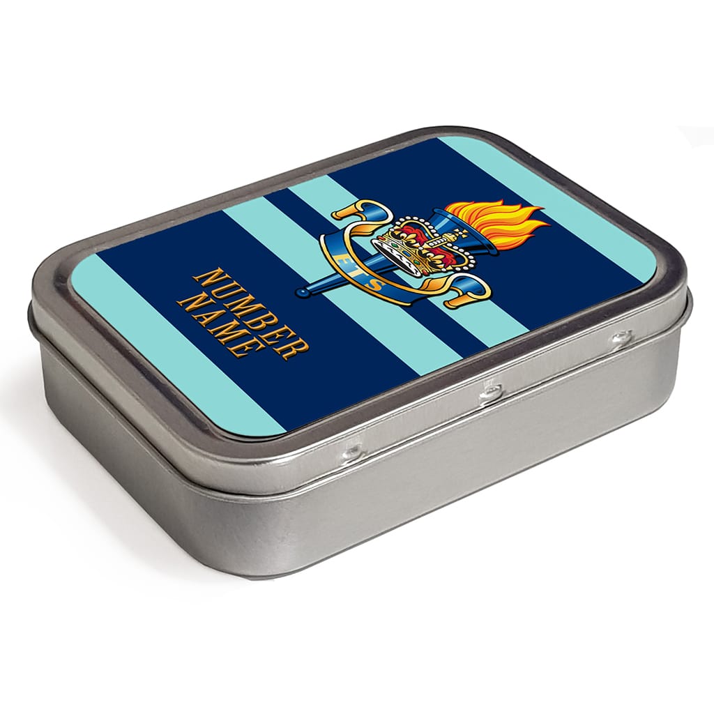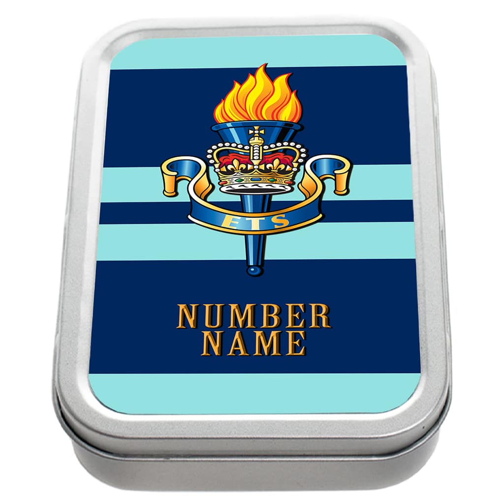 This personalised Education and Training Services Military Tobacco Tin with a classic regiment stripe and badge design is the perfect gift for Army Veterans, Serving Personnel and supporters of the British Armed Forces. Each tin is handmade for you, custom personalised with a name, military rank and/or number. A unique gift that is also practical.