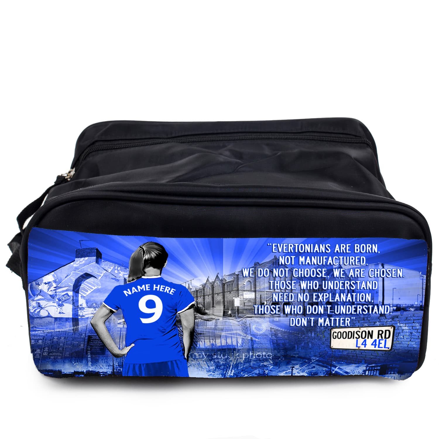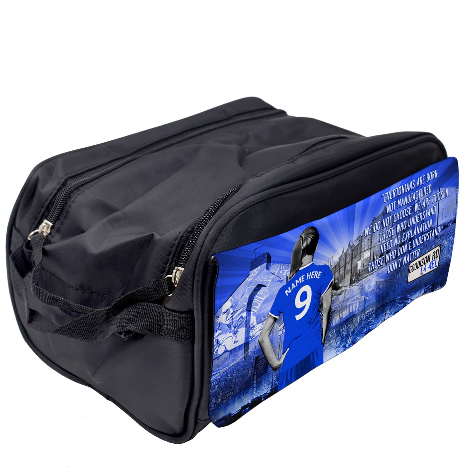 This Personalised Everton Women’s Football Boot Bag is handmade just for you and personalised with a name. A classic design featuring a women’s football player and shirt personalised with your name. It’s the perfect PE accessory for any girls’ football fan, and great for your child’s gym class.