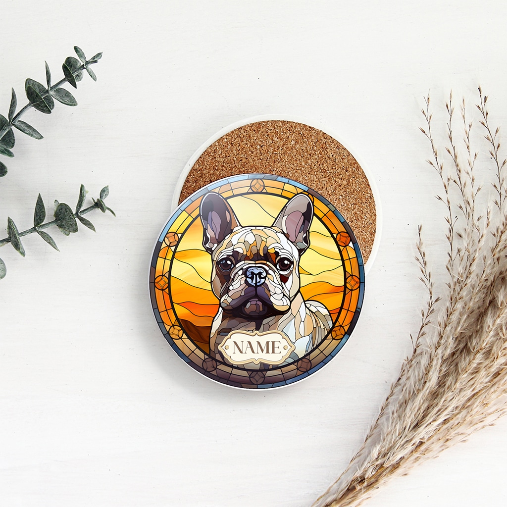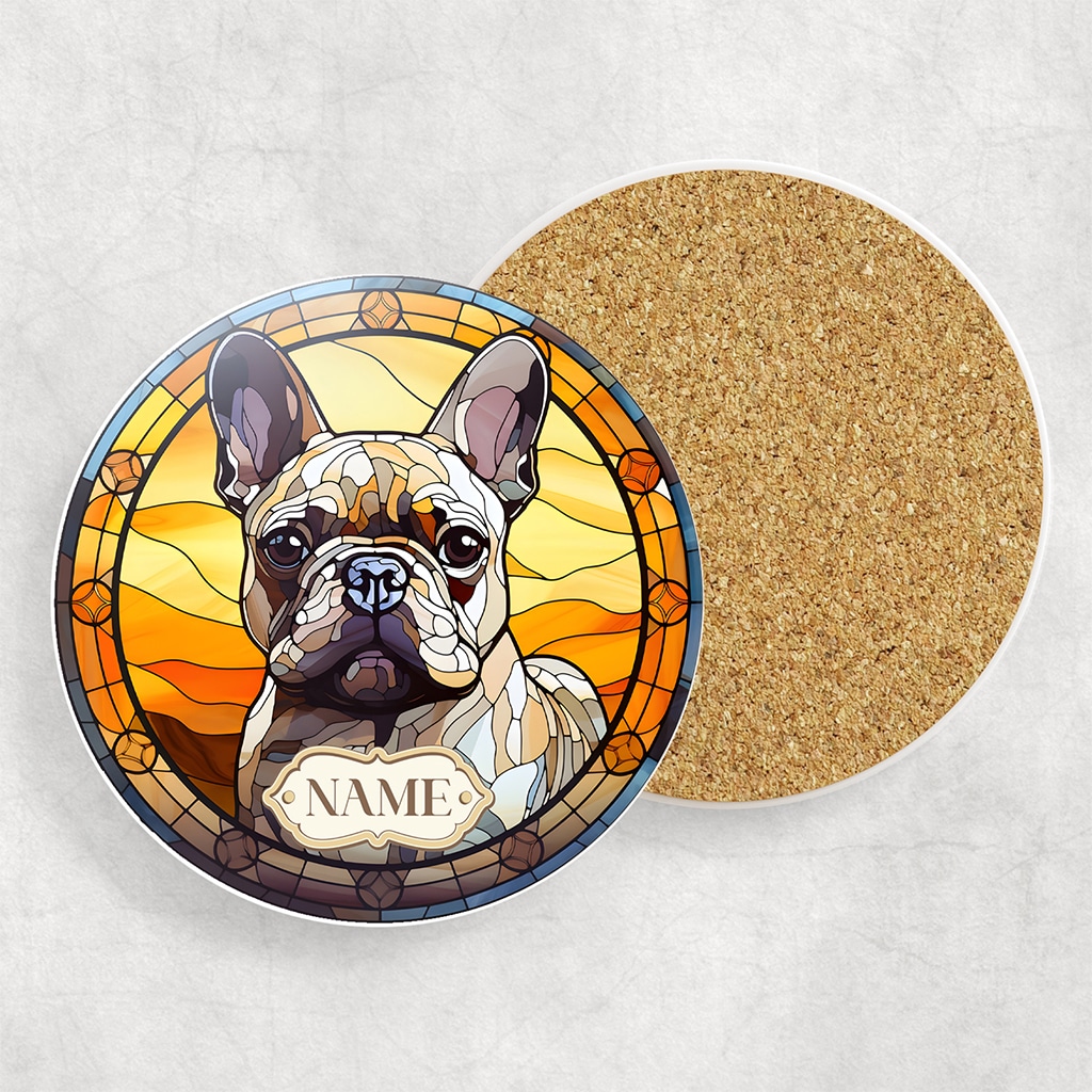 Personalised French Bulldog Frenchie Dog Portrait Coaster Drink Mat, the perfect gift for dog owners and puppy lovers, and custom personalised with your dog’s name.