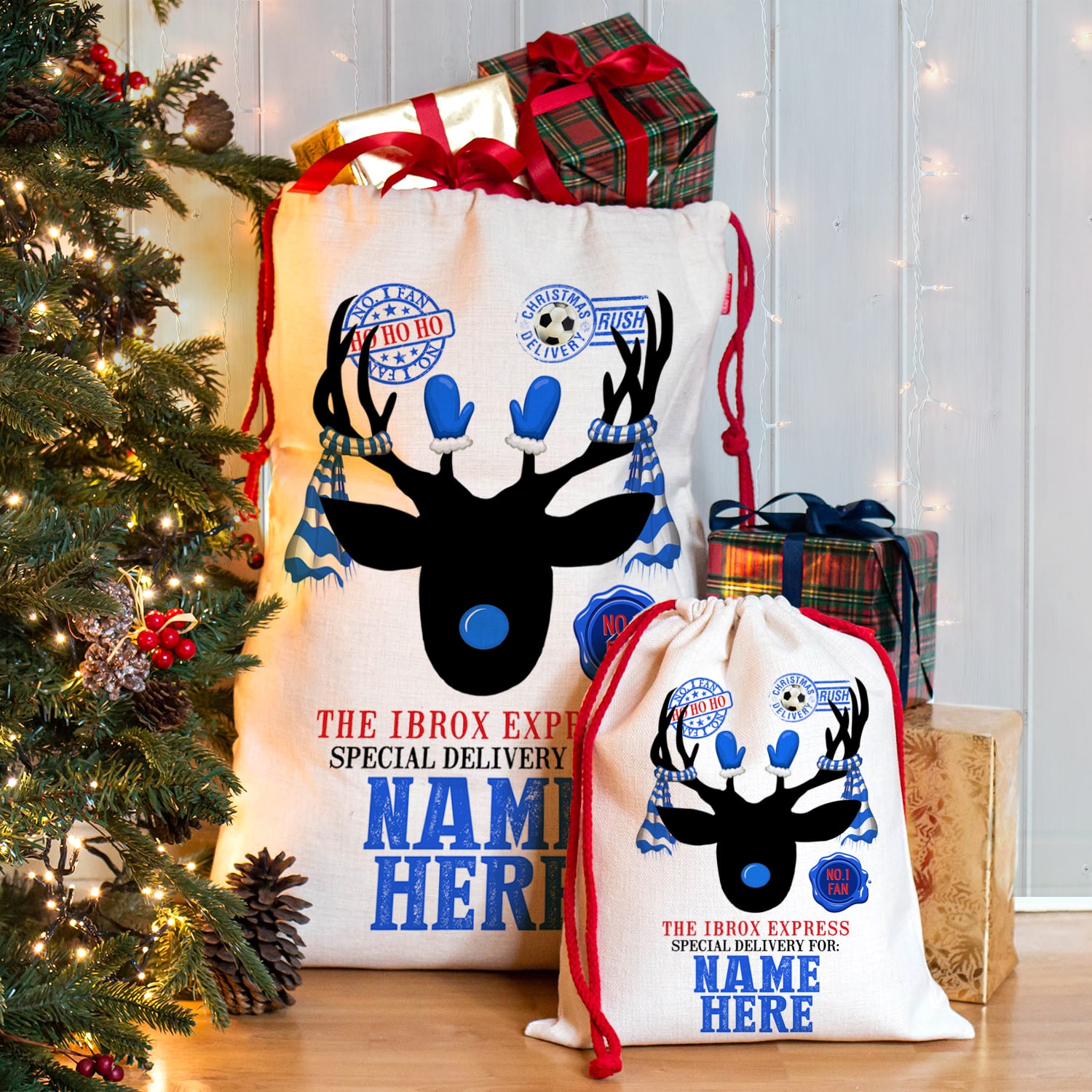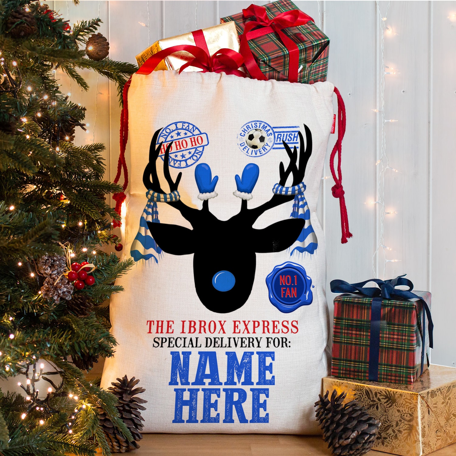 Personalised Glasgow Rangers Football Reindeer Christmas Sack is the ideal gift for any Football Fan. The beautiful sacks with festive red cord are ideal for Xmas day and will make any budding footballers Christmas!