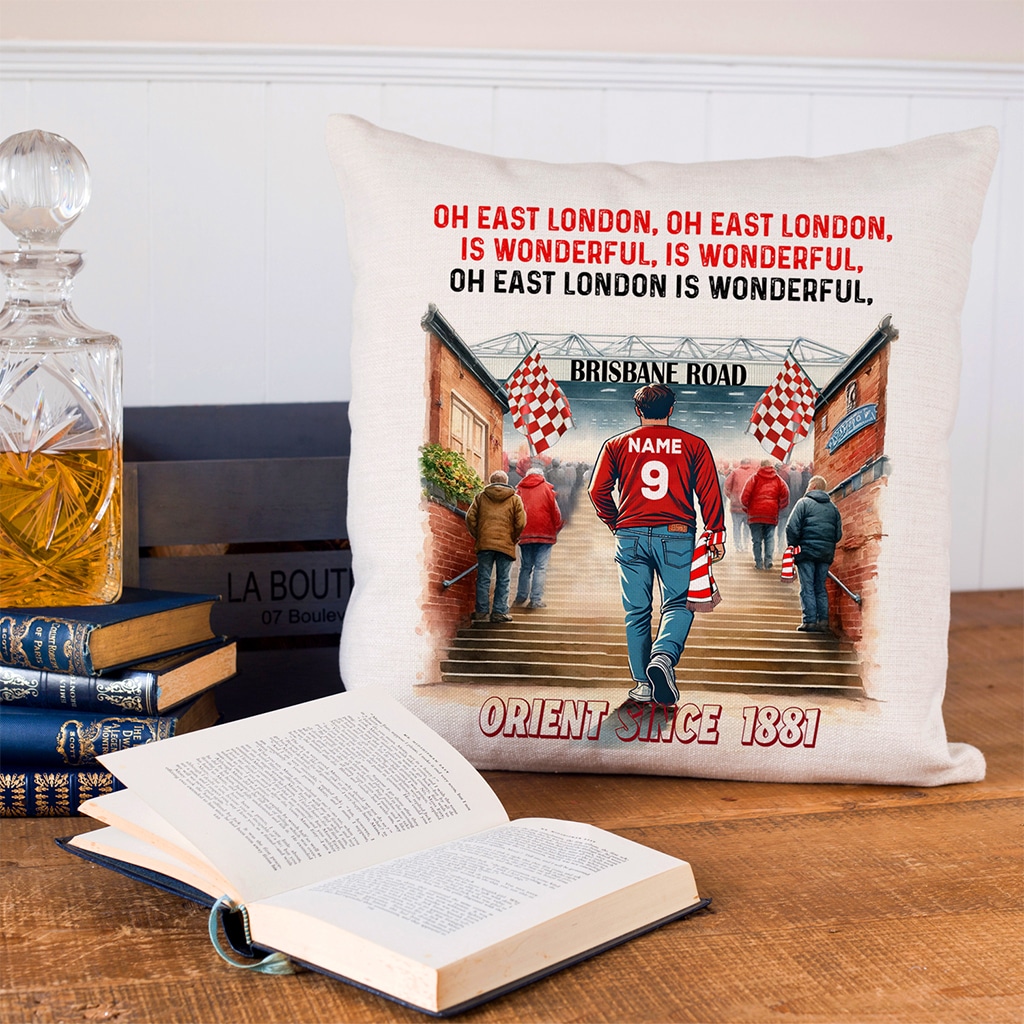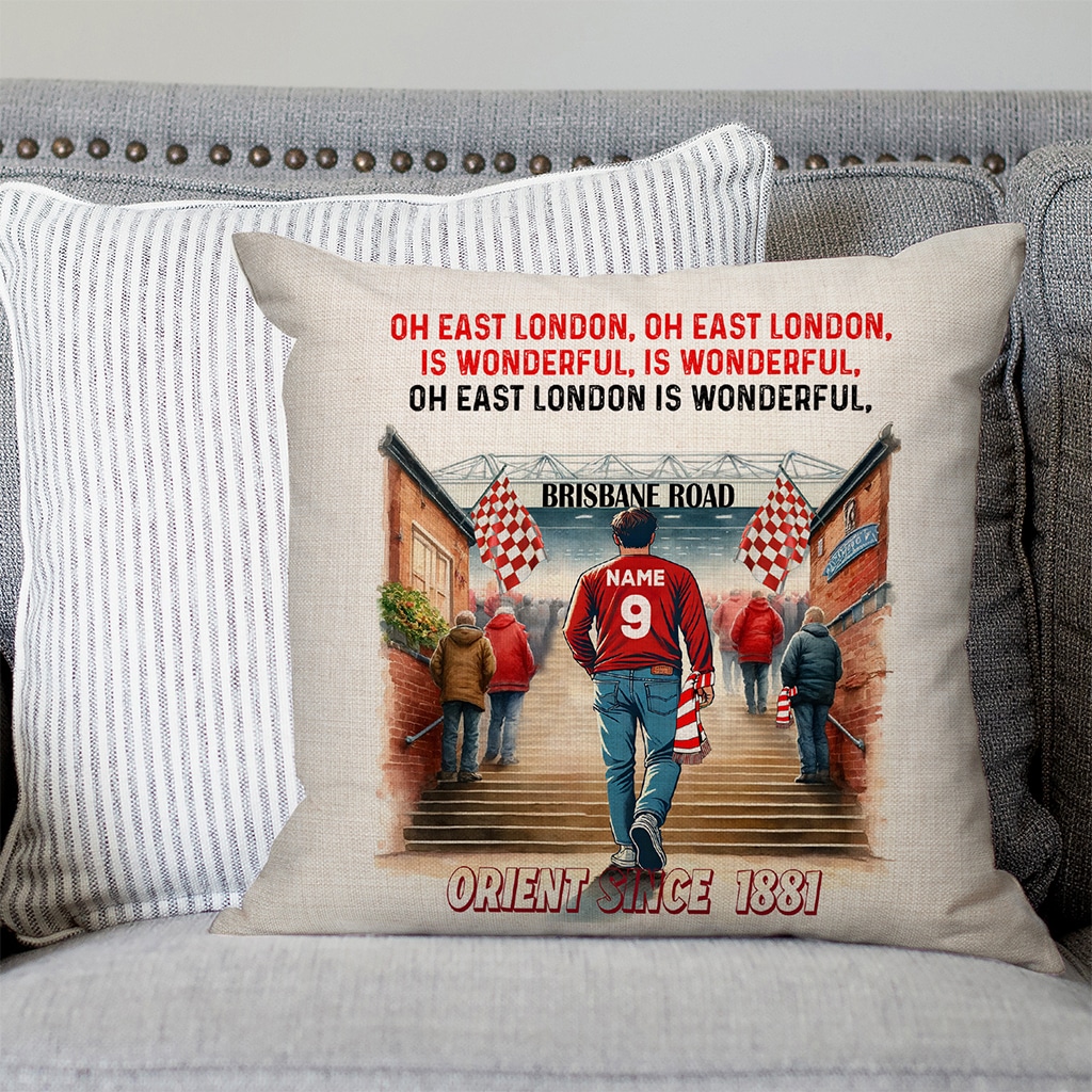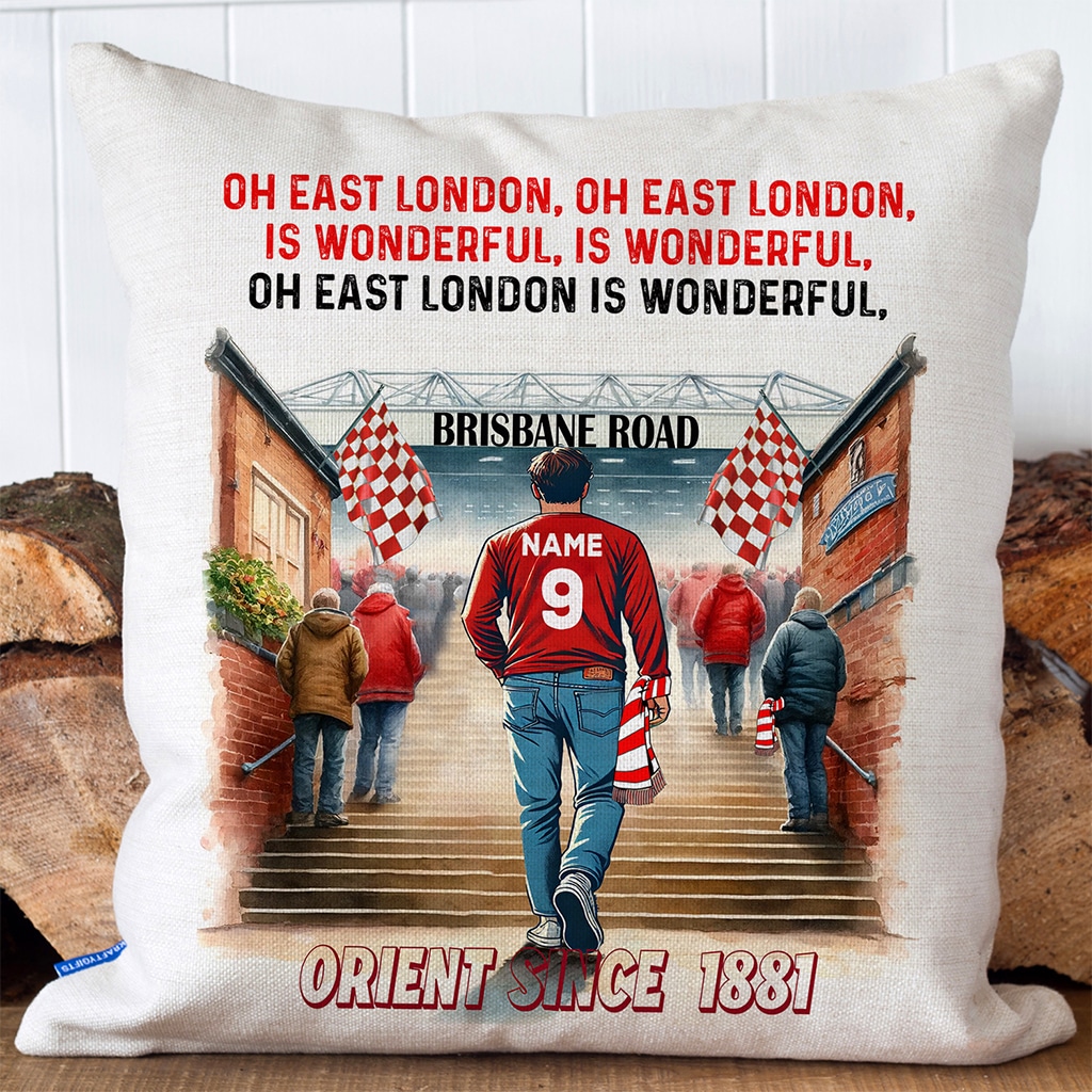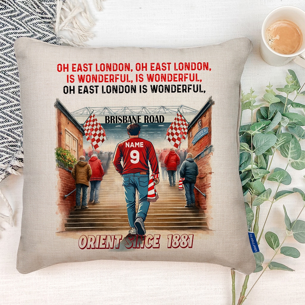 This Personalised Leyton Orient Football Watercolour Stadium Cushion Cover is the perfect match day football fan gift, custom personalised with your name and squad number.