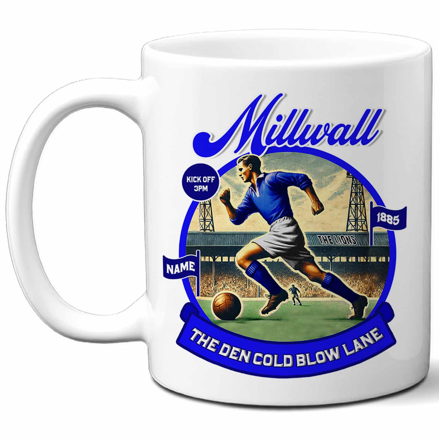 Personalised Millwall Football Nostalgia Mug, the perfect gift for any football fan. These custom tea / coffee cups are ideal birthday gifts and Christmas stocking fillers. Any name can be printed on to the mug, making it a beautiful keepsake for any retro football fan. A great gift for retirement.