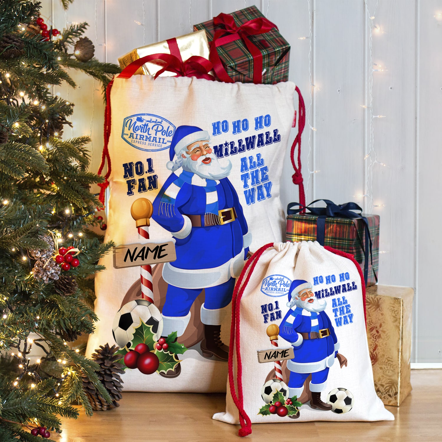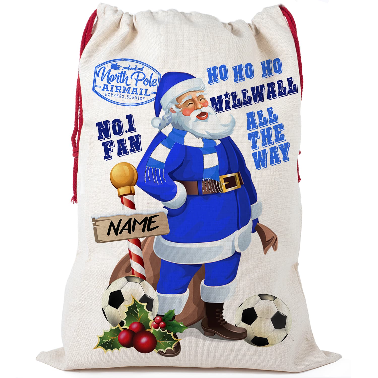 Personalised Milwall Football Christmas Sack is the ideal gift for any Football Fan. The beautiful sacks with festive red cord are ideal for Xmas day and will make any budding footballers Christmas!