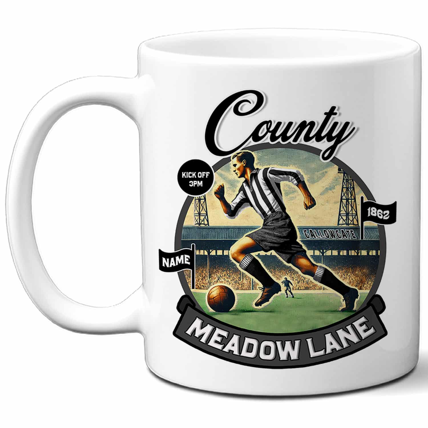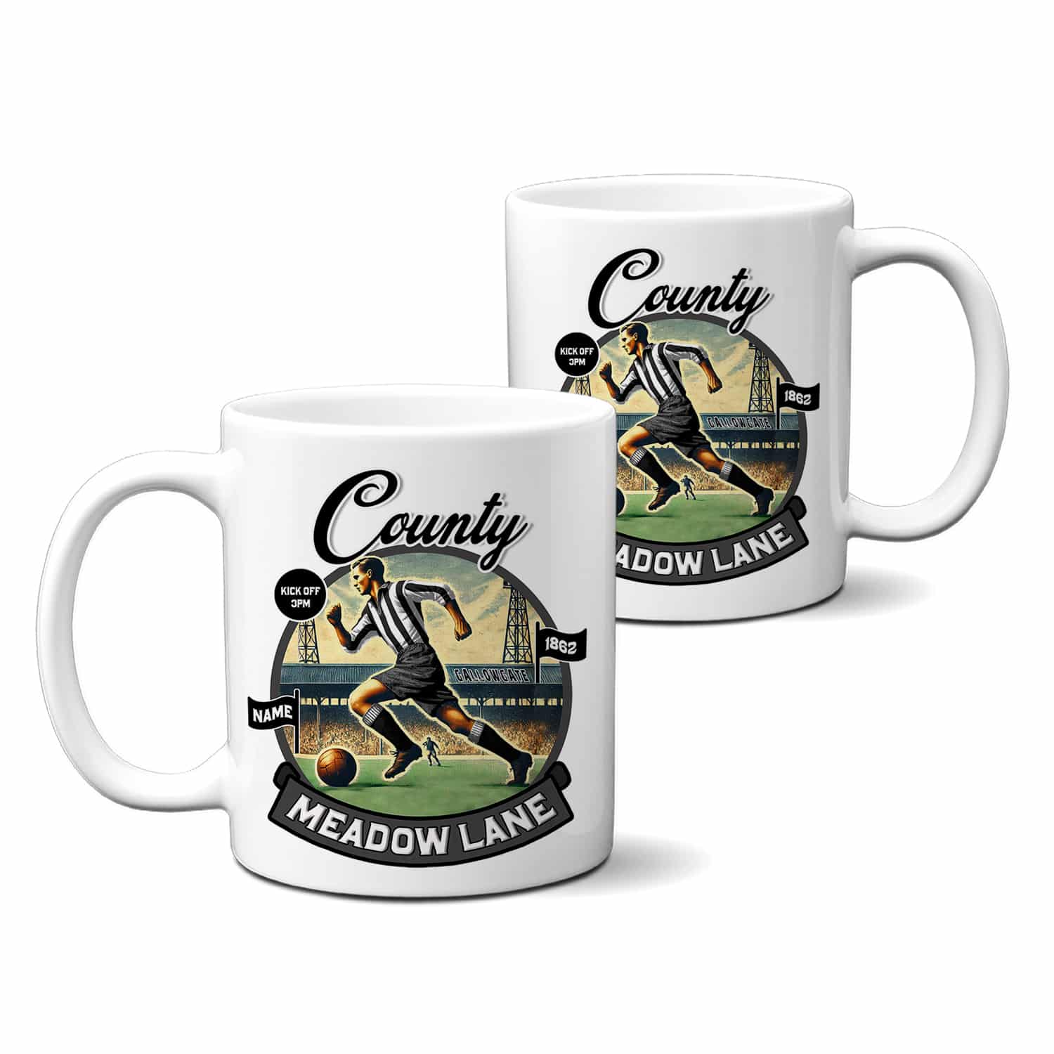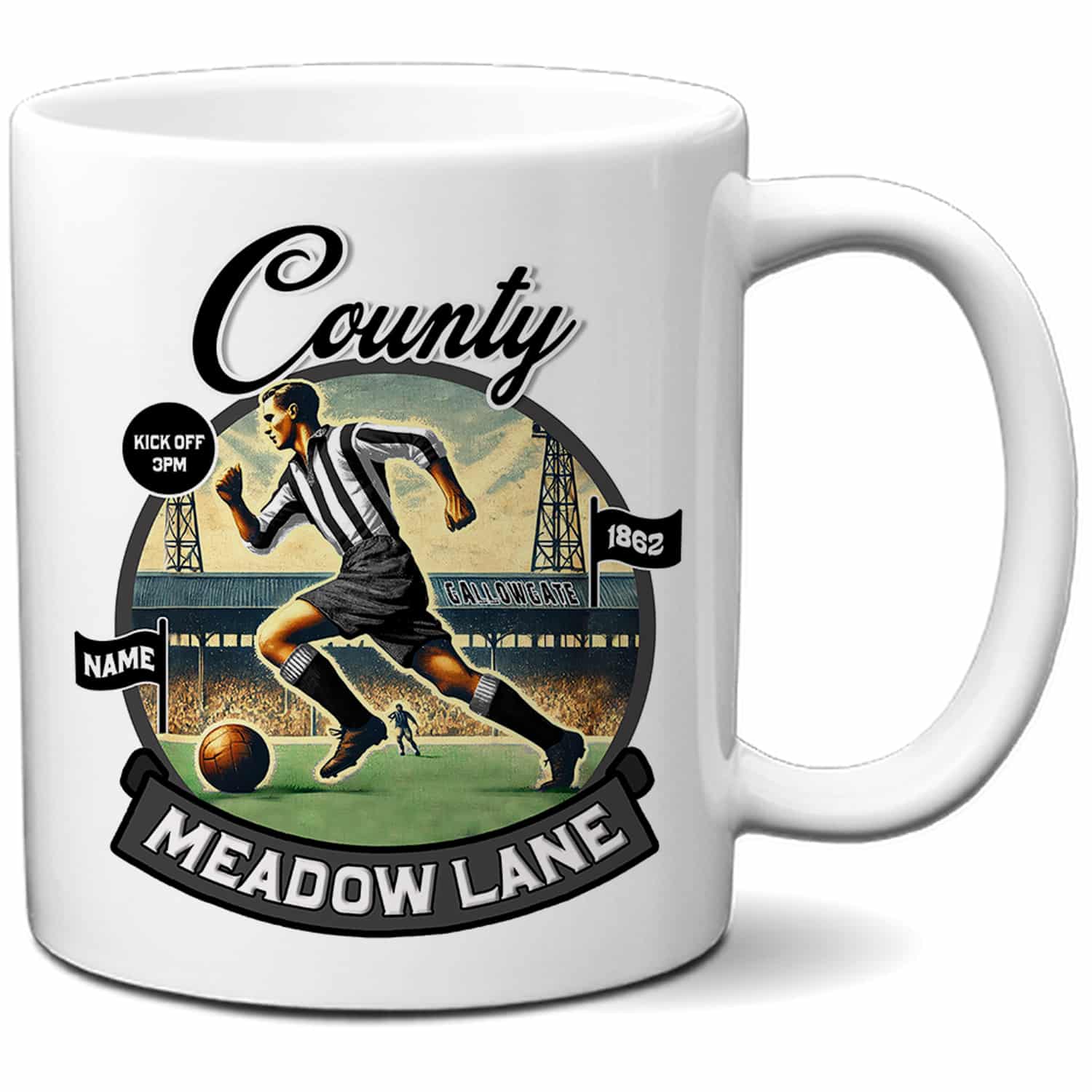 Personalised Notts County Football Nostalgia Mug, the perfect gift for any football fan. These custom tea / coffee cups are ideal birthday gifts and Christmas stocking fillers. Any name can be printed on to the mug, making it a beautiful keepsake for any retro football fan. A great gift for retirement.