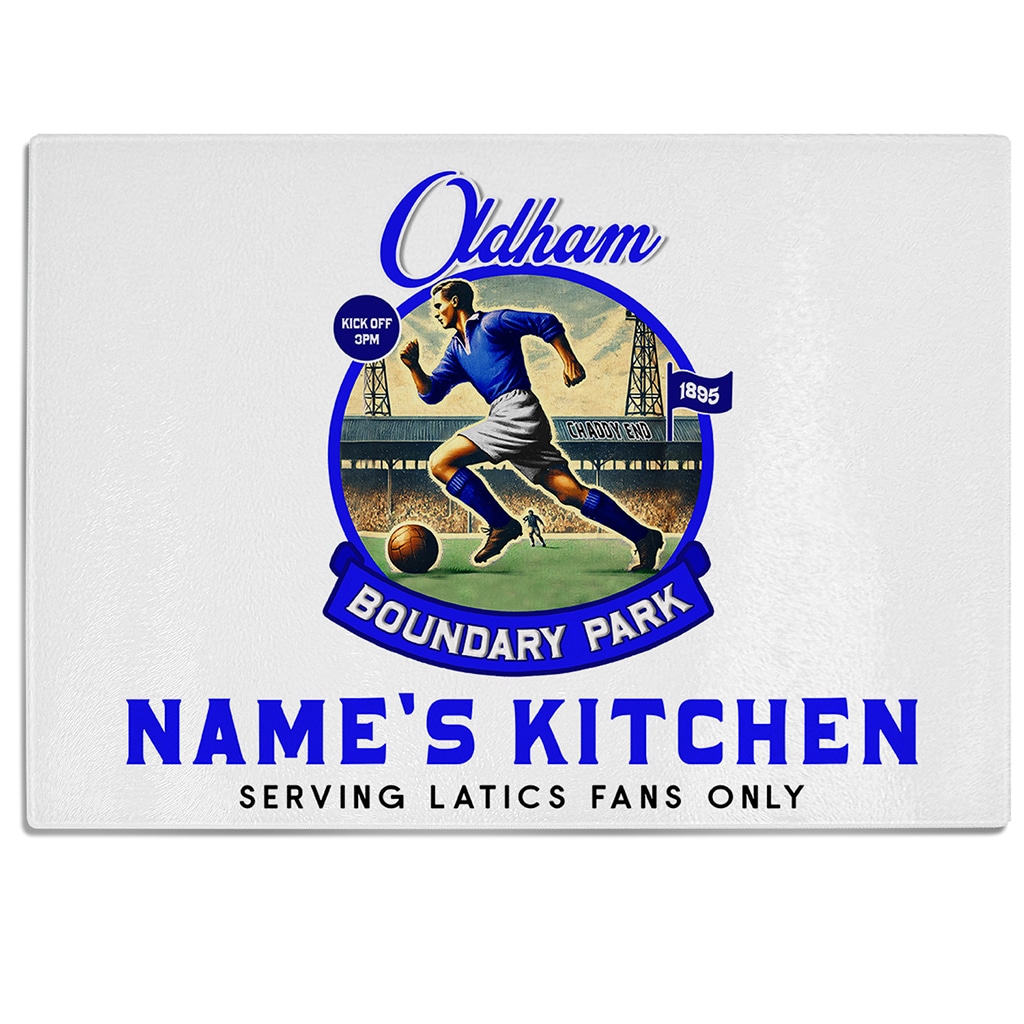 Personalised Oldham Vintage Nostalgia Football Chopping Board Glass Worktop Saver, the Perfect the Perfect Football Team Fan Gift!