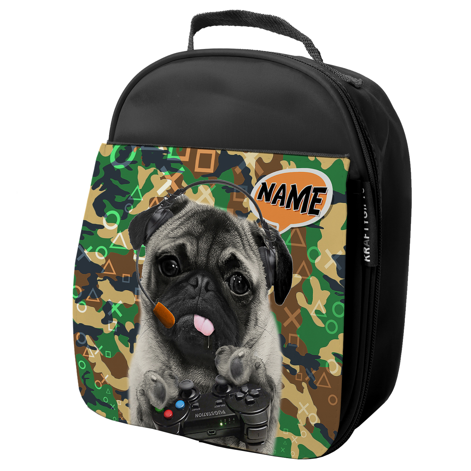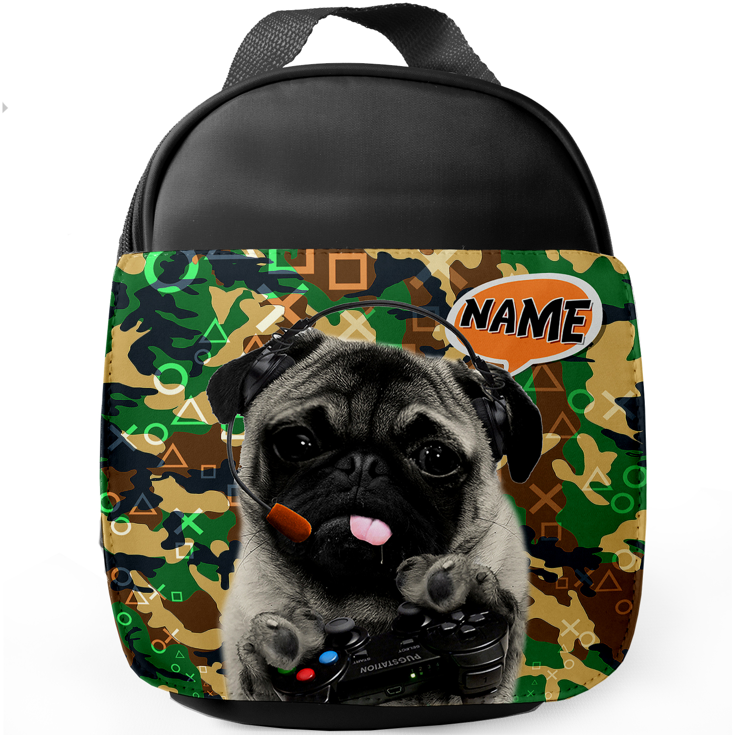 Personalised Pug Gamer Black School Lunch Bag CAMOPUG