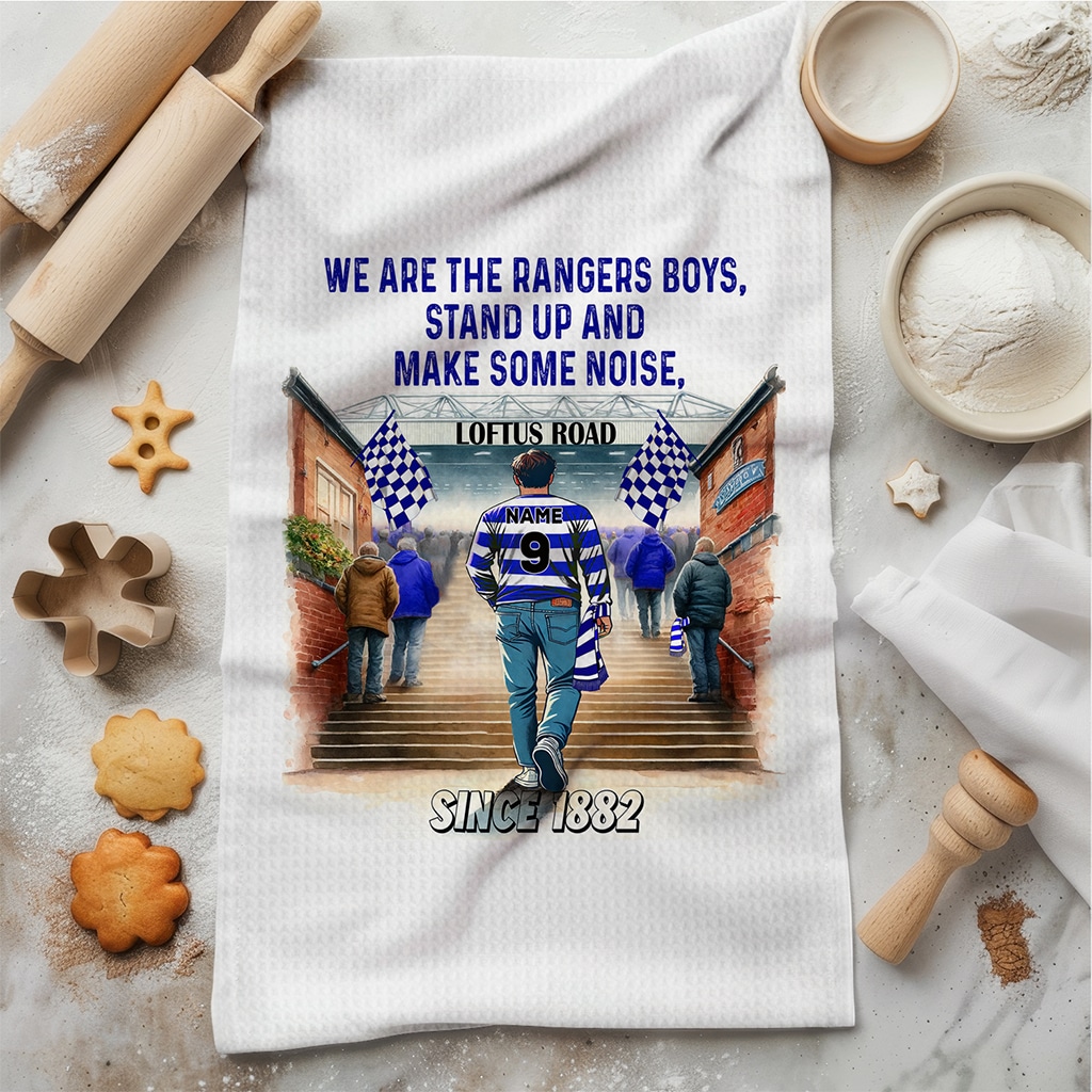 This Personalised Queens Park Rangers Football Stadium Kitchen Tea Towel is perfect for every football fan, custom personalised with a name and squad number.