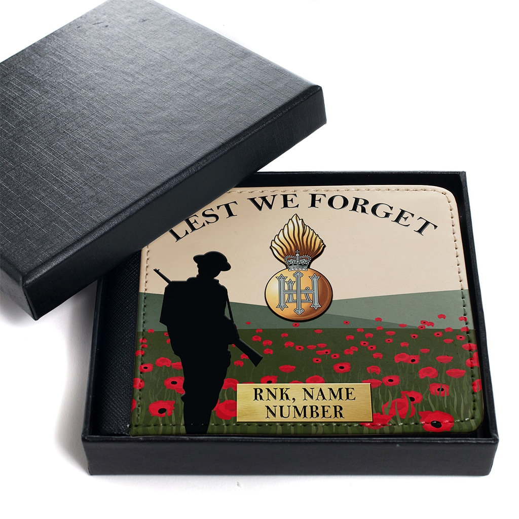 This personalised Royal Highland Fusiliers Military Wallet with a classic Soldier and Poppy design is the perfect gift for Army Veterans, Serving Personnel and supporters of the British Armed Forces. Each wallet is handmade for you, custom personalised with a name, military rank and number. A unique gift that is also practical, our bi-fold wallets have card slots, cash and coin compartments!