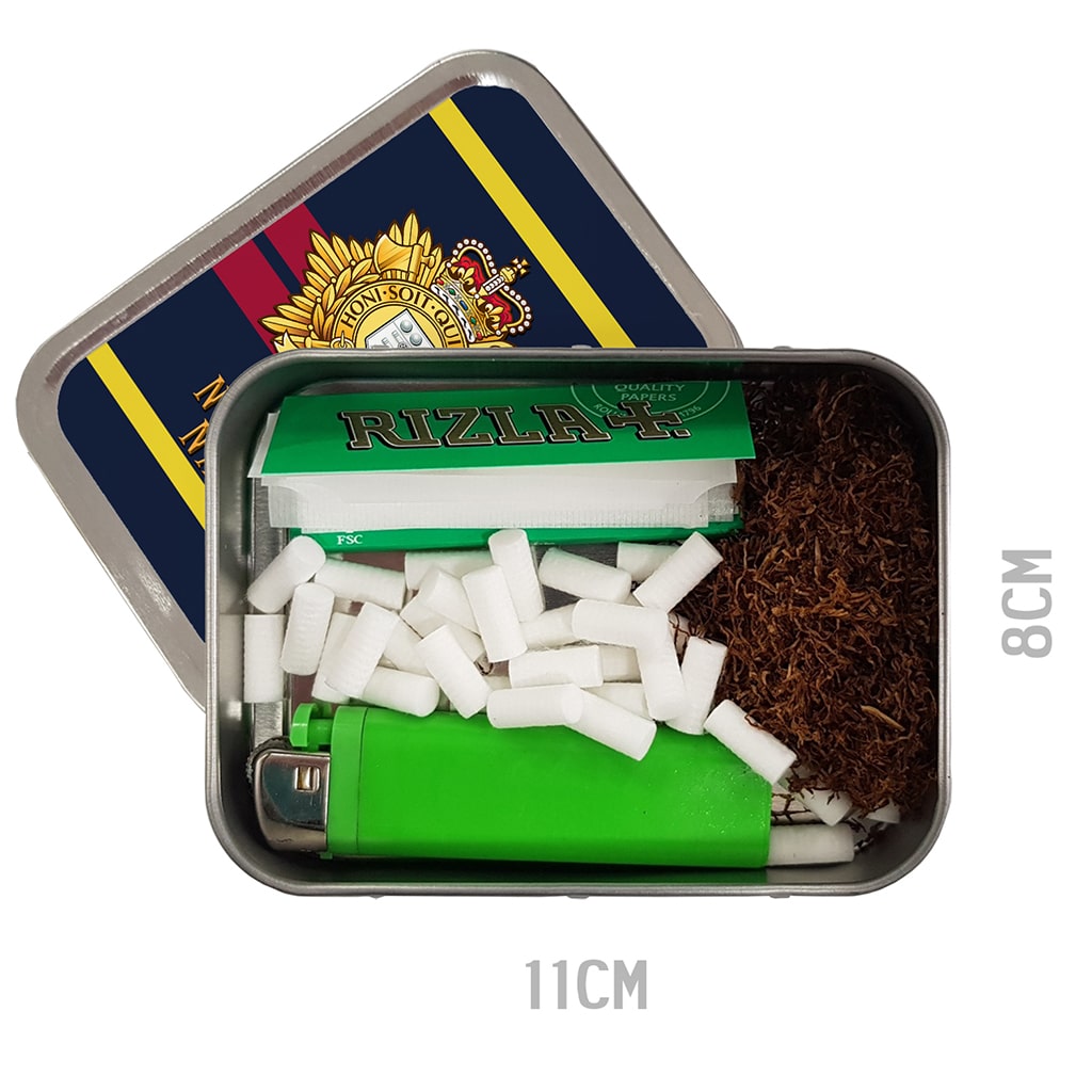 This personalised Royal Logistic Corps Military Tobacco Tin with a classic regiment stripe and badge design is the perfect gift for Army Veterans, Serving Personnel and supporters of the British Armed Forces. Each tin is handmade for you, custom personalised with a name, military rank and/or number. A unique gift that is also practical.
