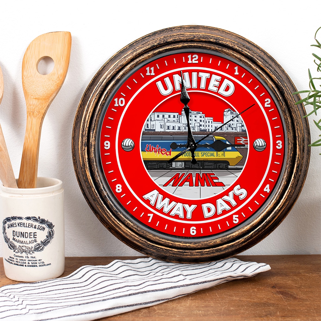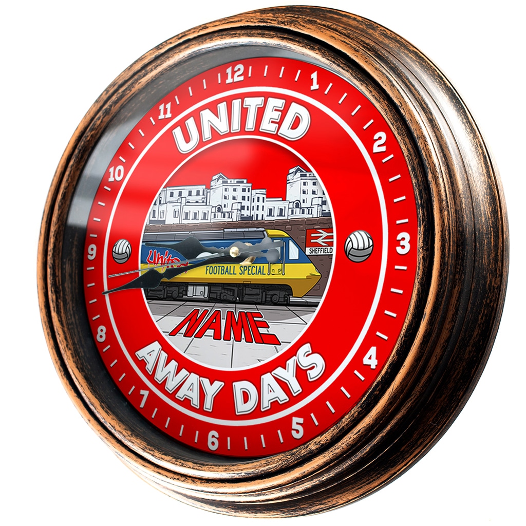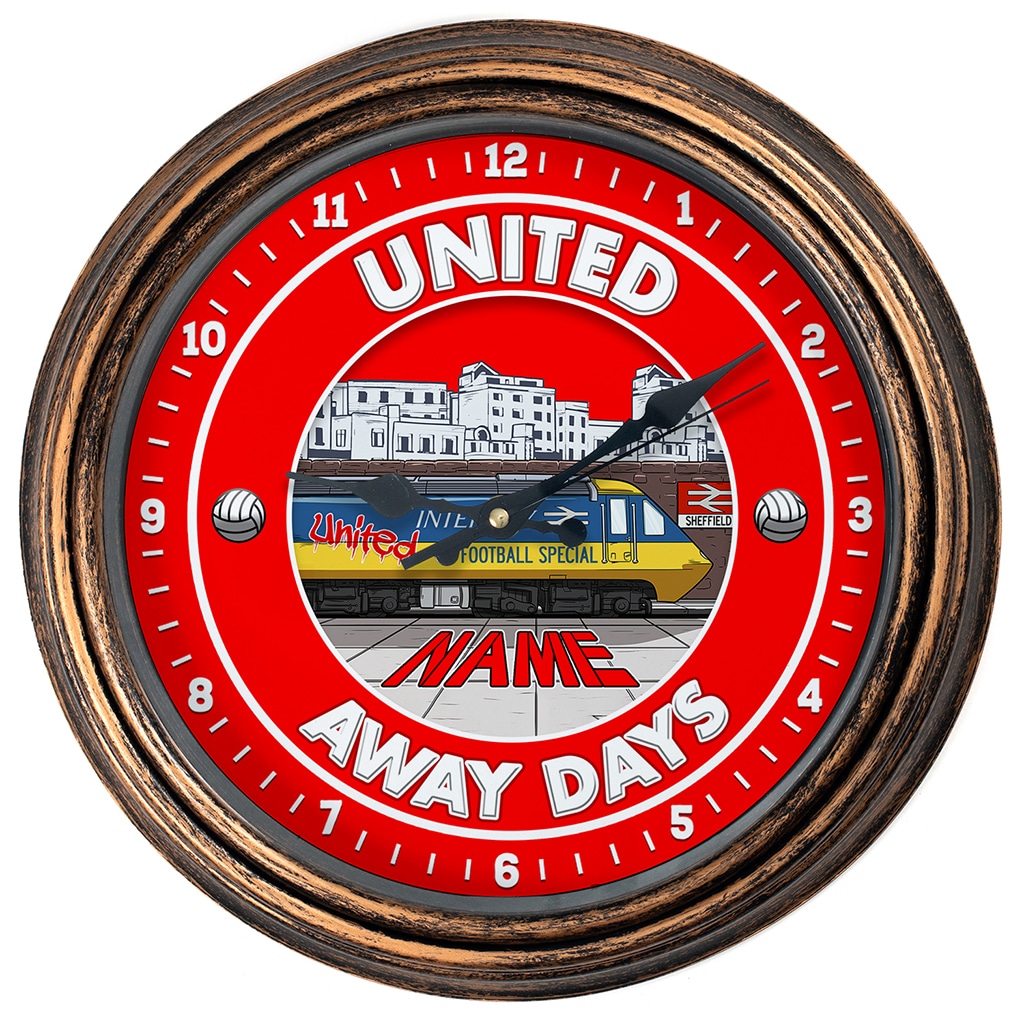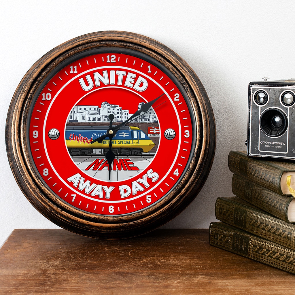 Personalised Sheffield United Football Away Days Wall Clock, the perfect retro football team home decor gift for any occasion including birthdays, housewarming, retirement, or Father’s Day.