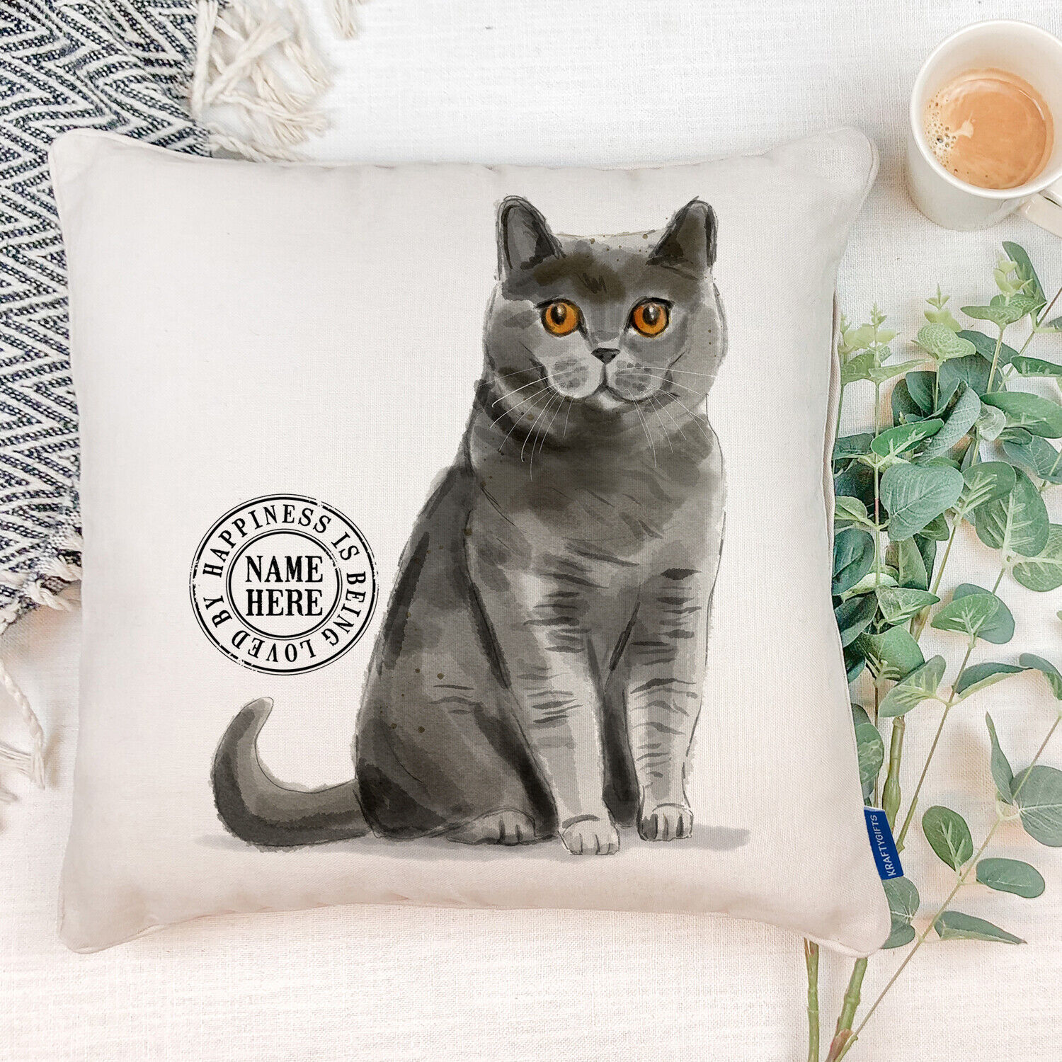 Using soft linen material, the ‘Happiness Is Being Loved By’ pillow can be personalise with any kitty name.