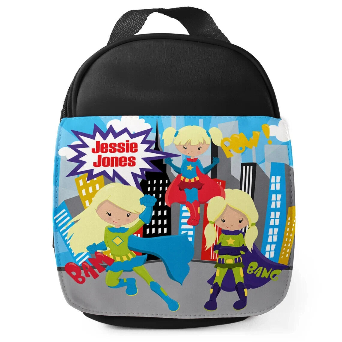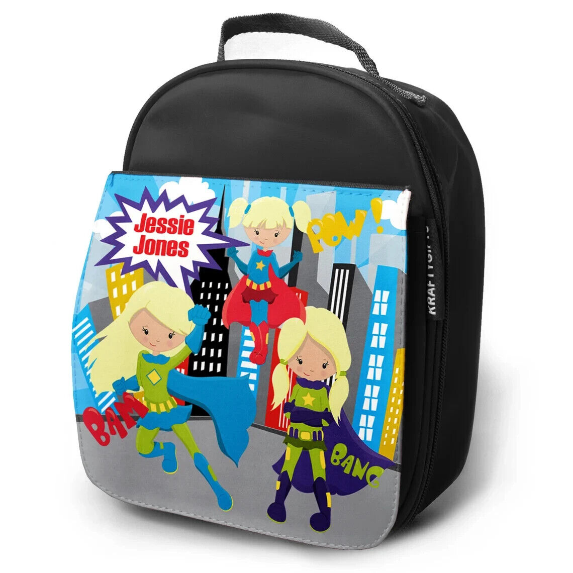 Personalised Superhero Kids Black Nursery School Lunch Bag EC027