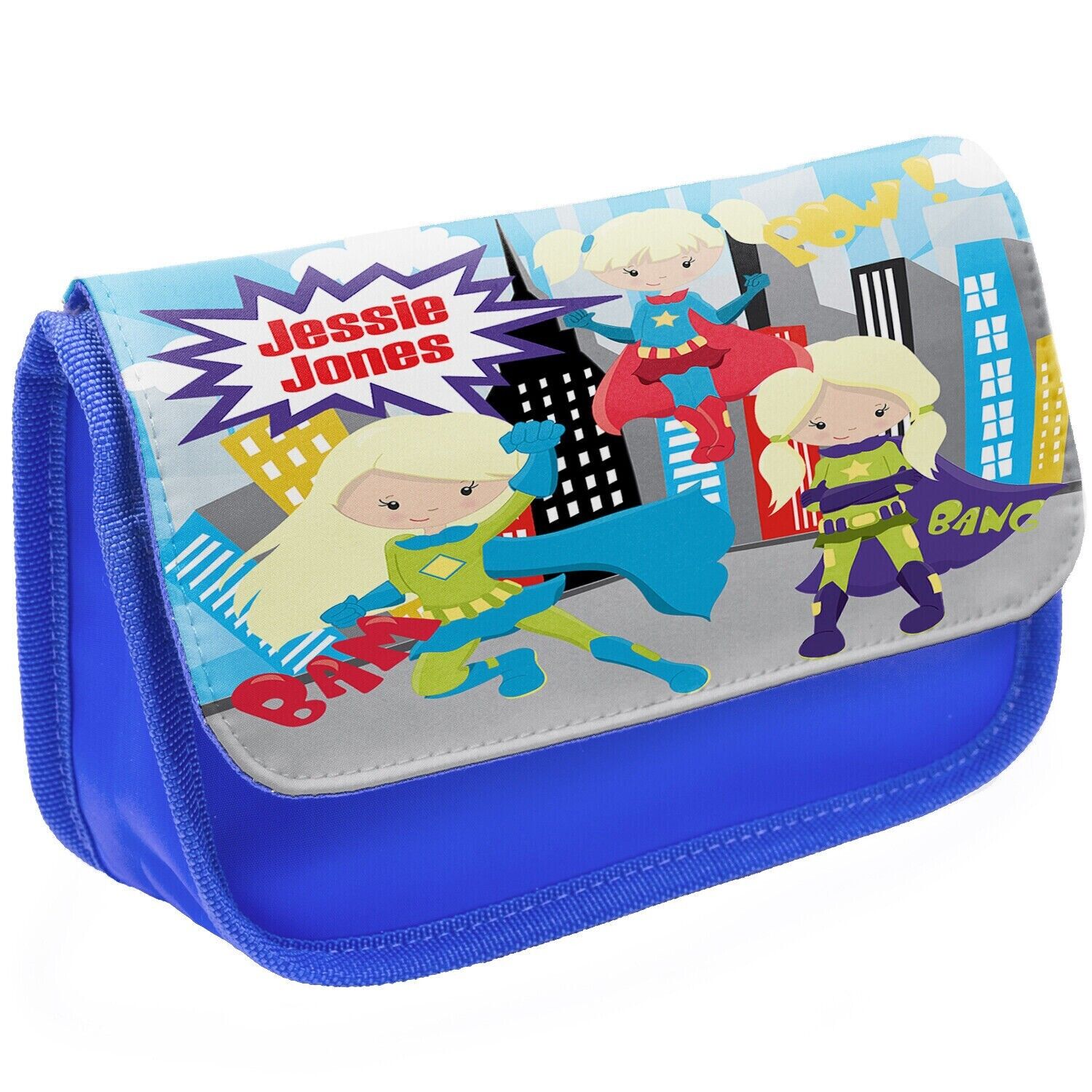 Personalised Superhero Kids Blue Pencil Case Stationery Bag EC027