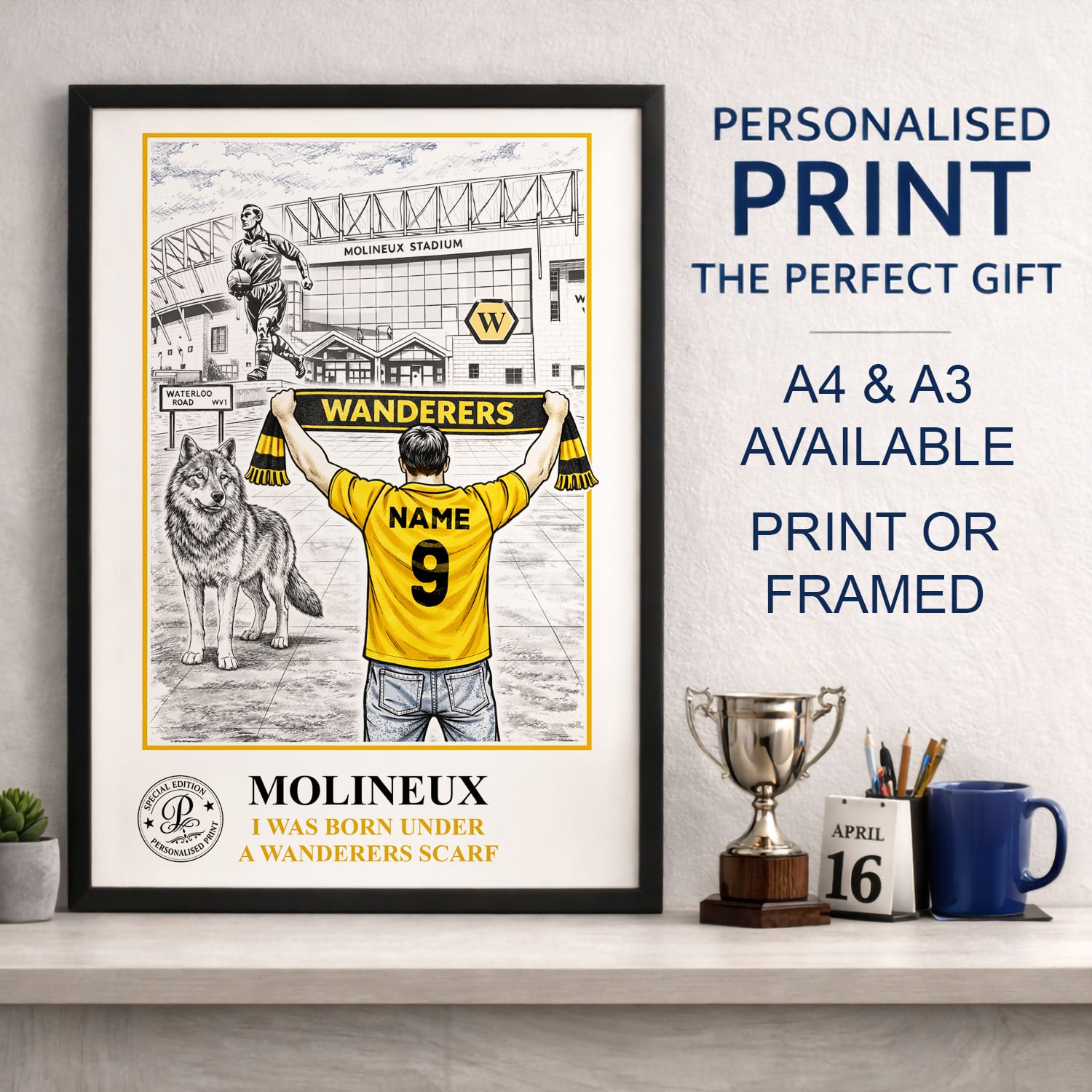 Personalised Wolves Football Stadium Print A3 A4 Framed Unframed FSP63