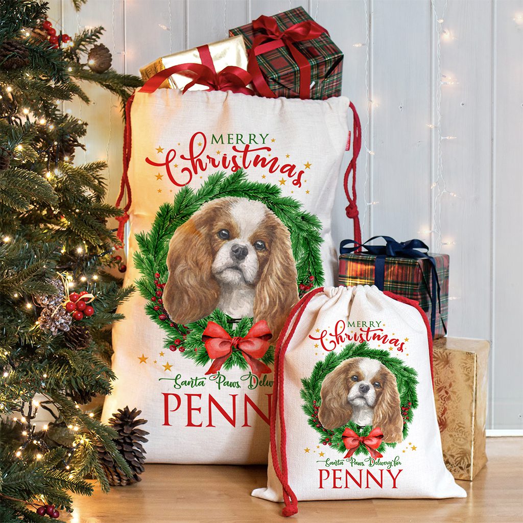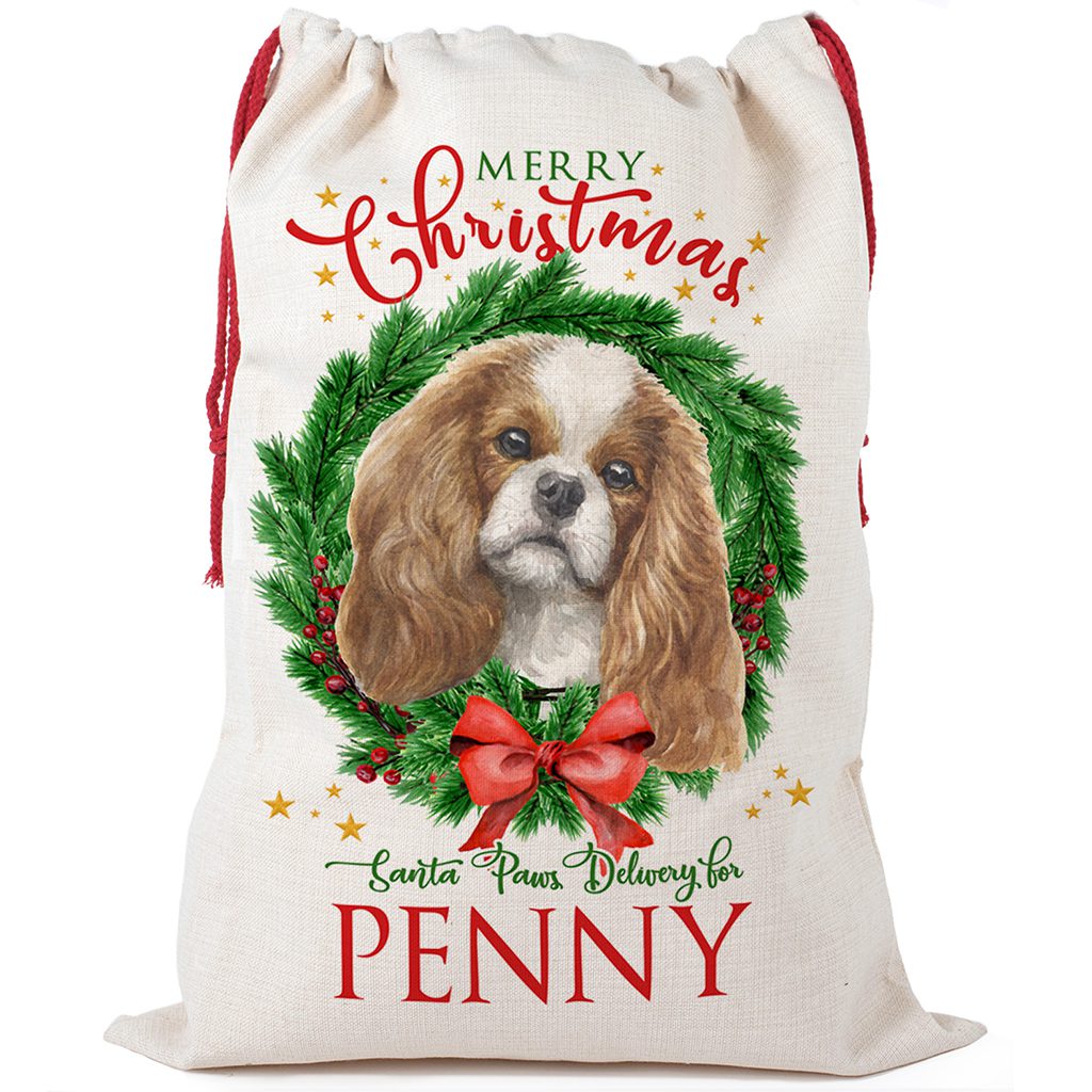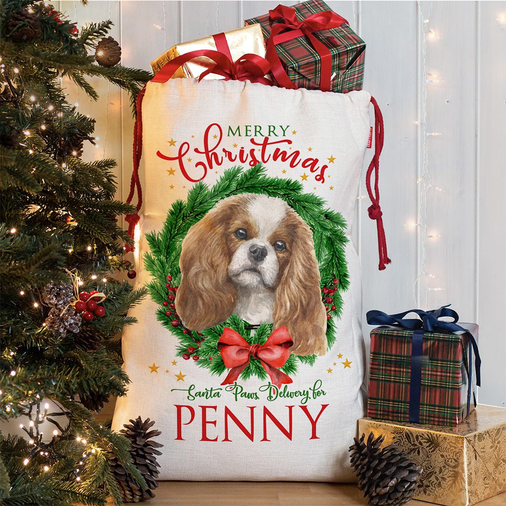 Personalised Cavalier King Charles Spaniel Dog Christmas Santa Sack — perfect to hold festive treats for your furry friend!