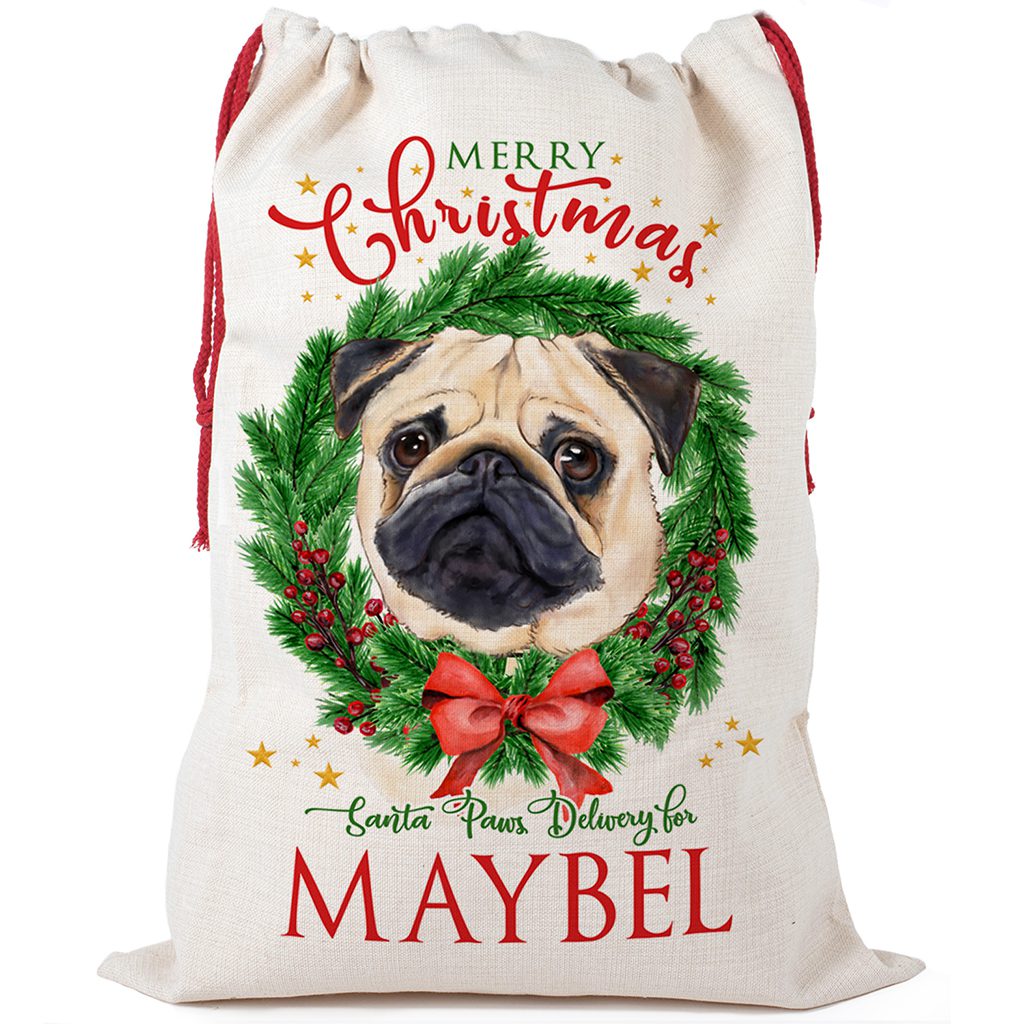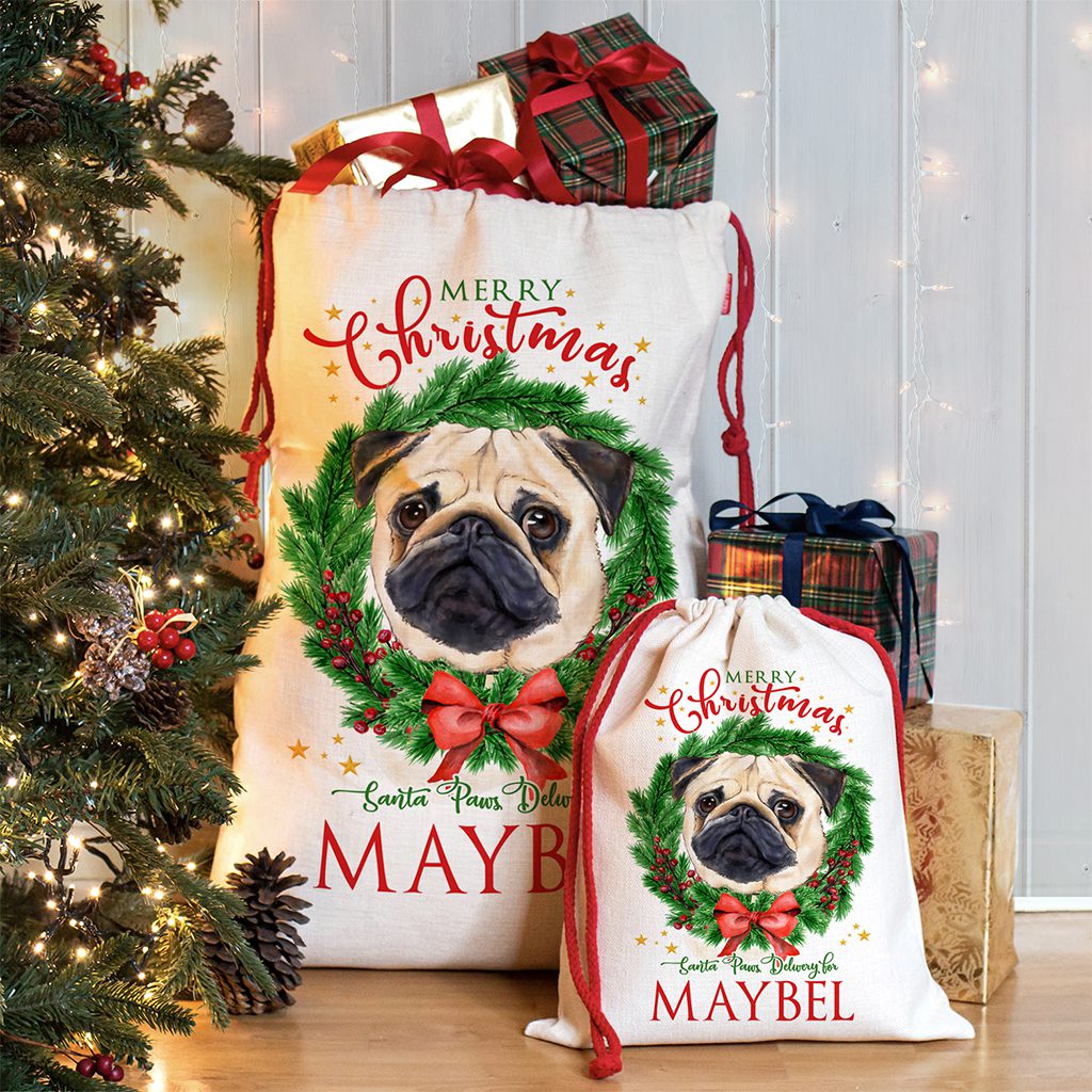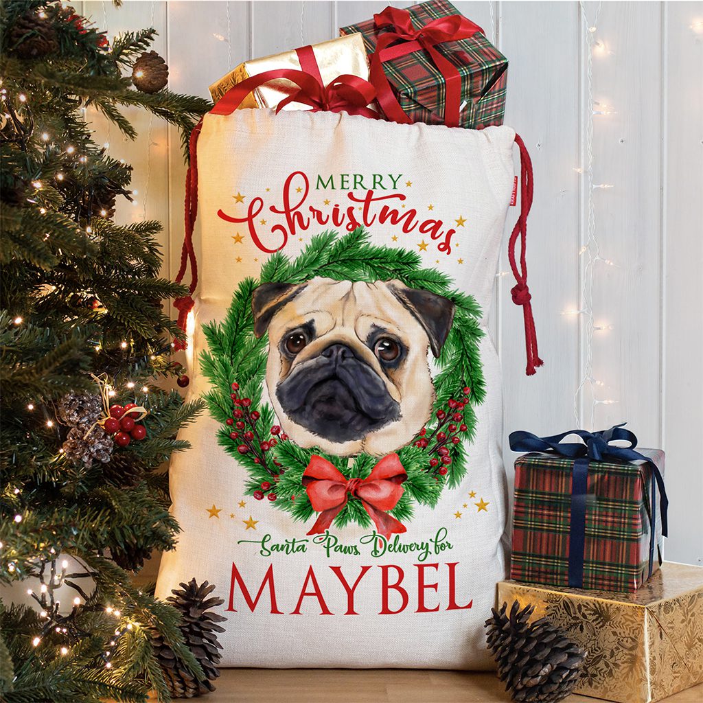 Personalised Pug Dog Christmas Santa Sack — perfect to hold festive treats for your furry friend!
