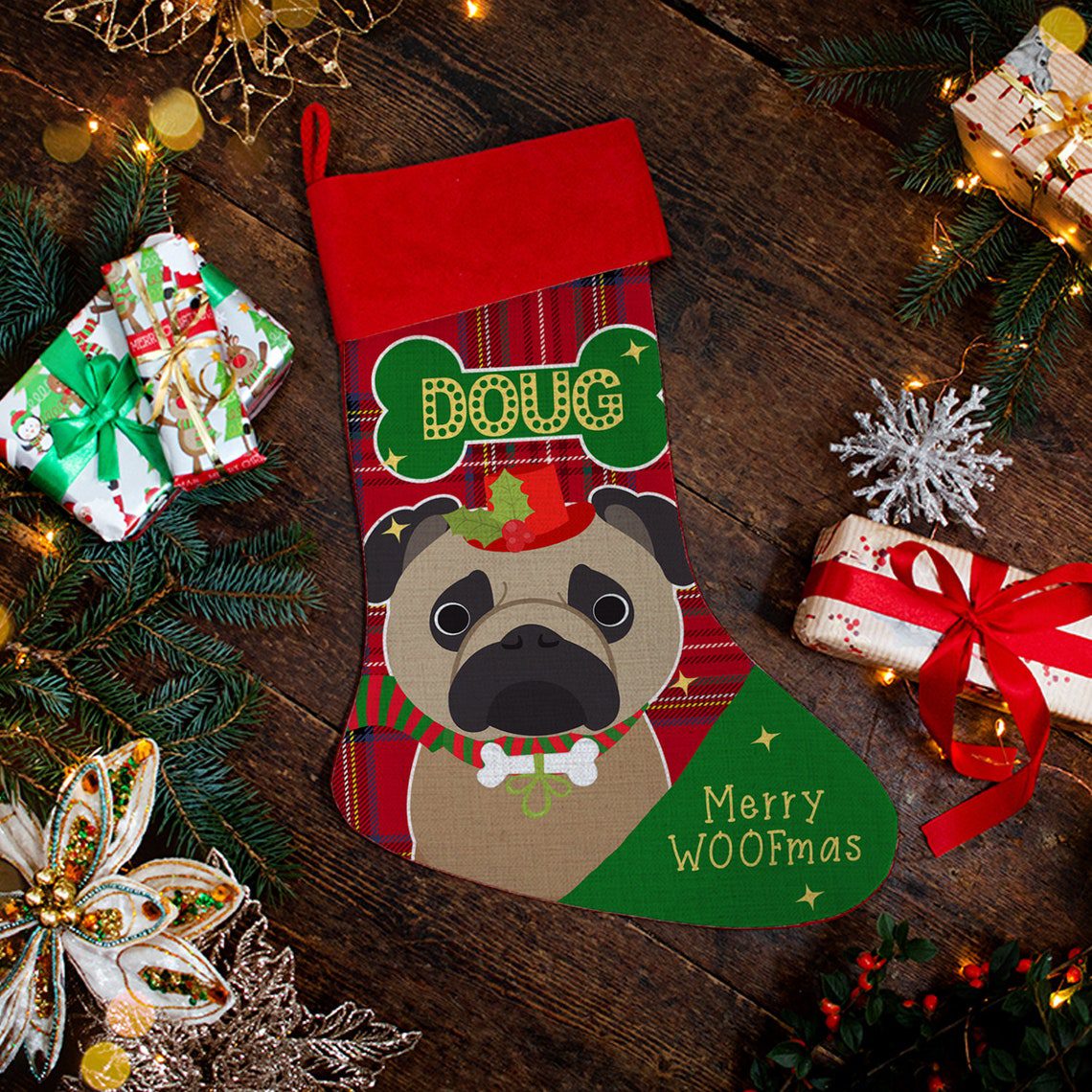 Personalised Fawn Brown Pug Dog Christmas Treat Stocking — great seasonal decor and perfect to hold festive treats for your furry friend!