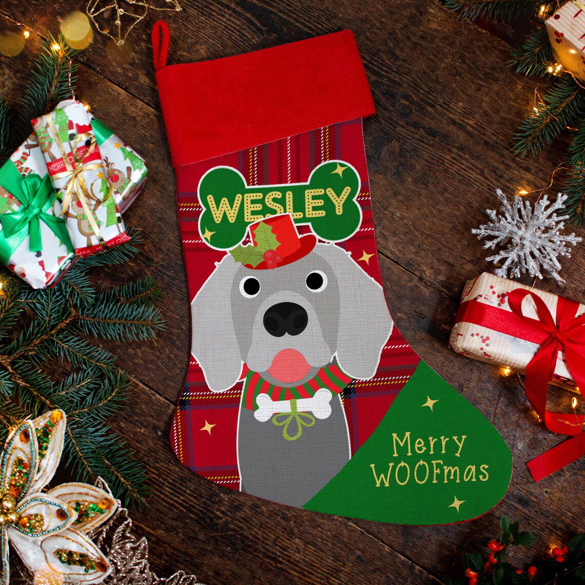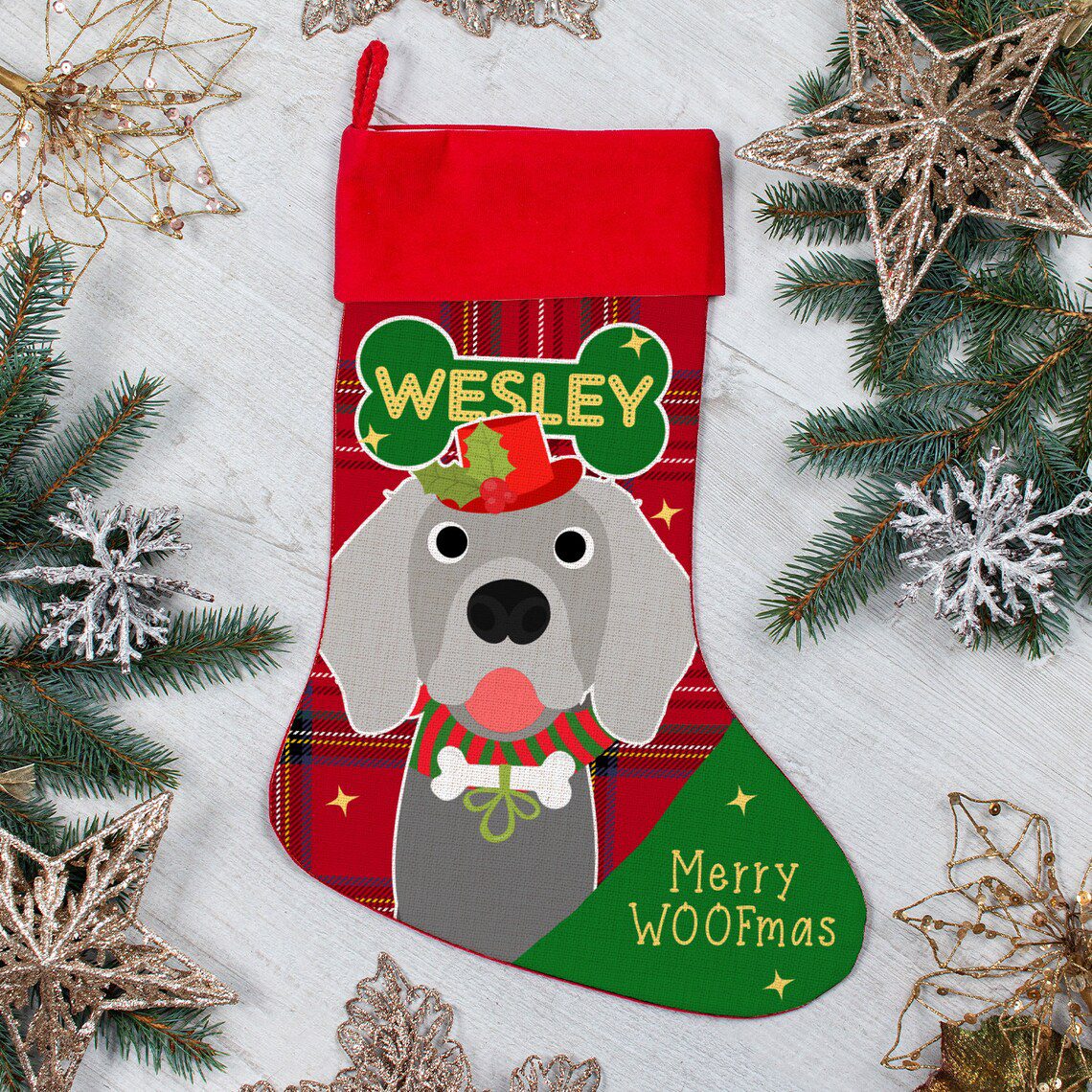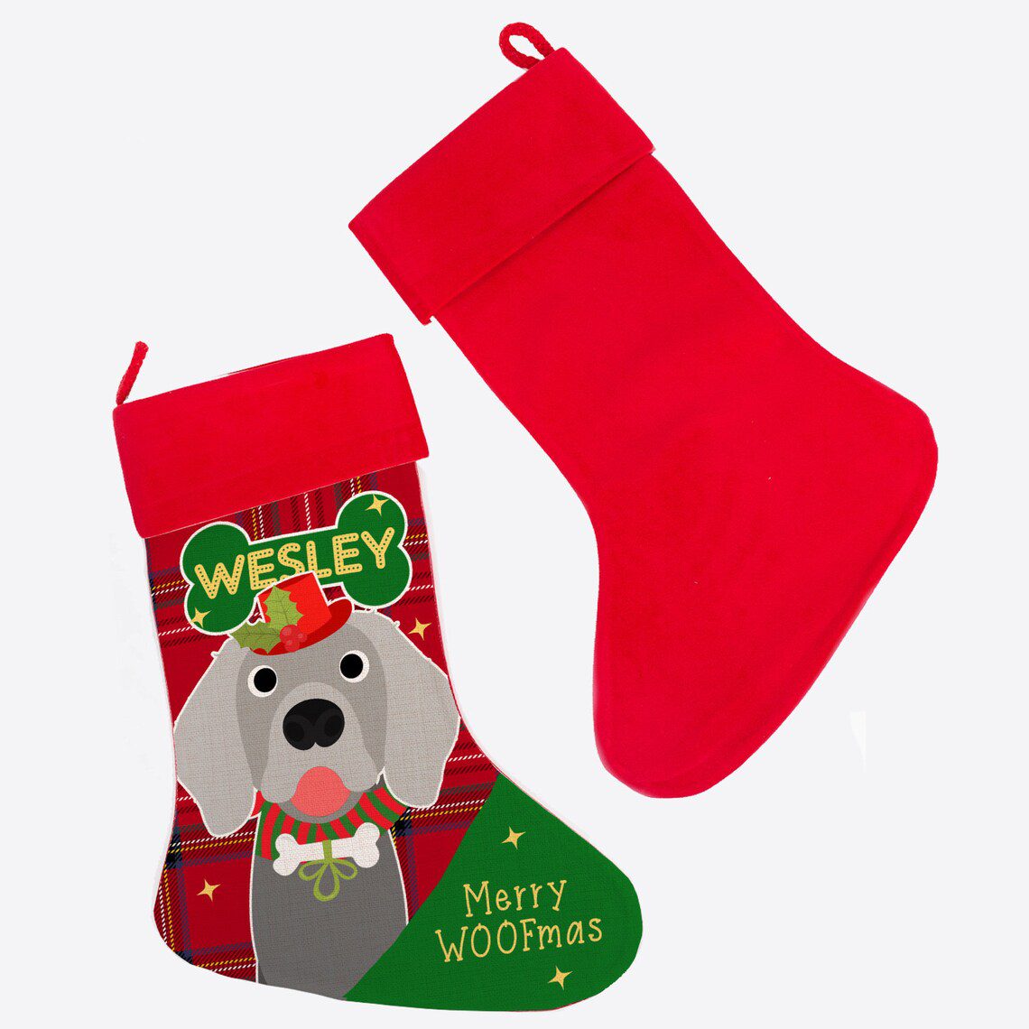Personalised Weimaraner Dog Christmas Treat Stocking — great seasonal decor and perfect to hold festive treats for your furry friend!