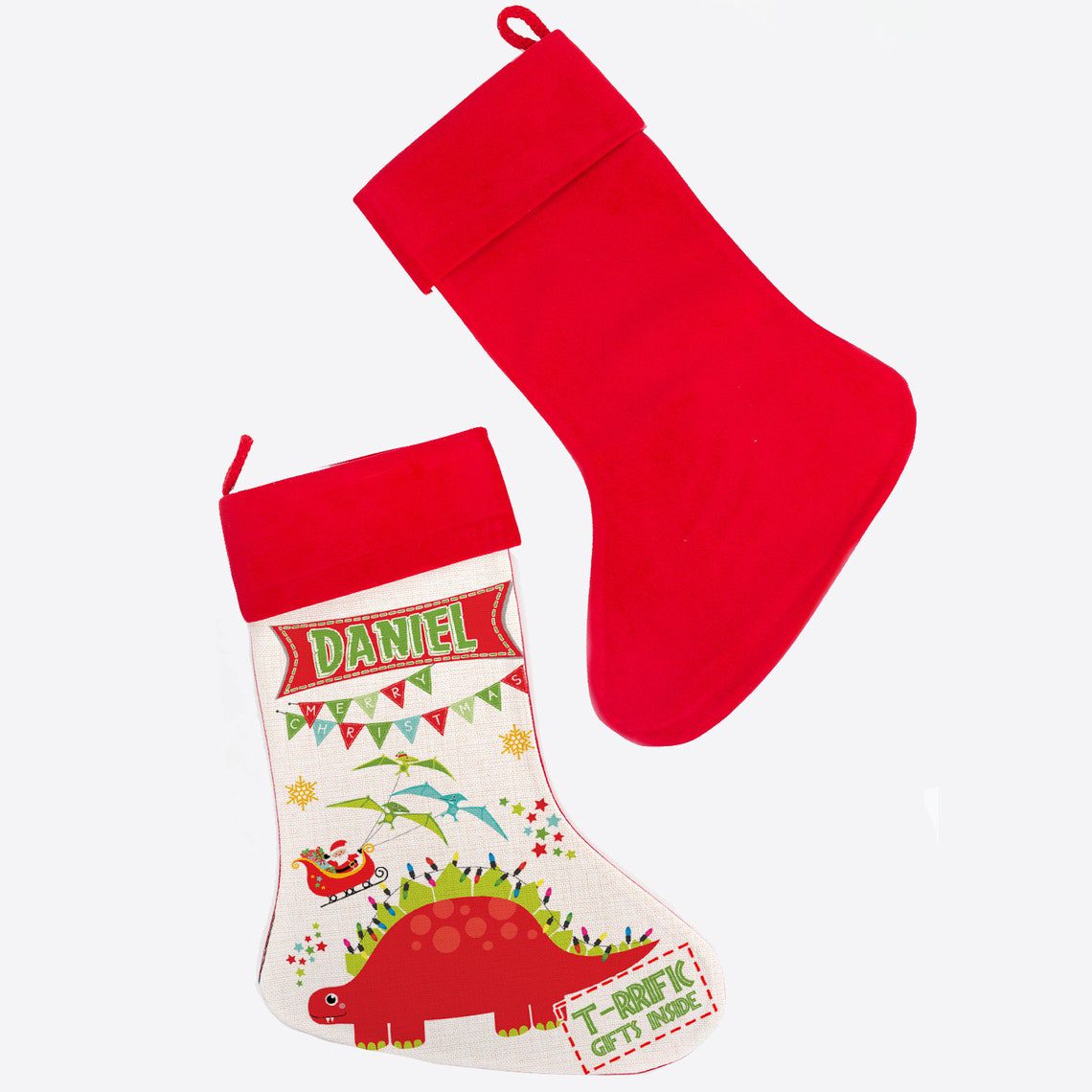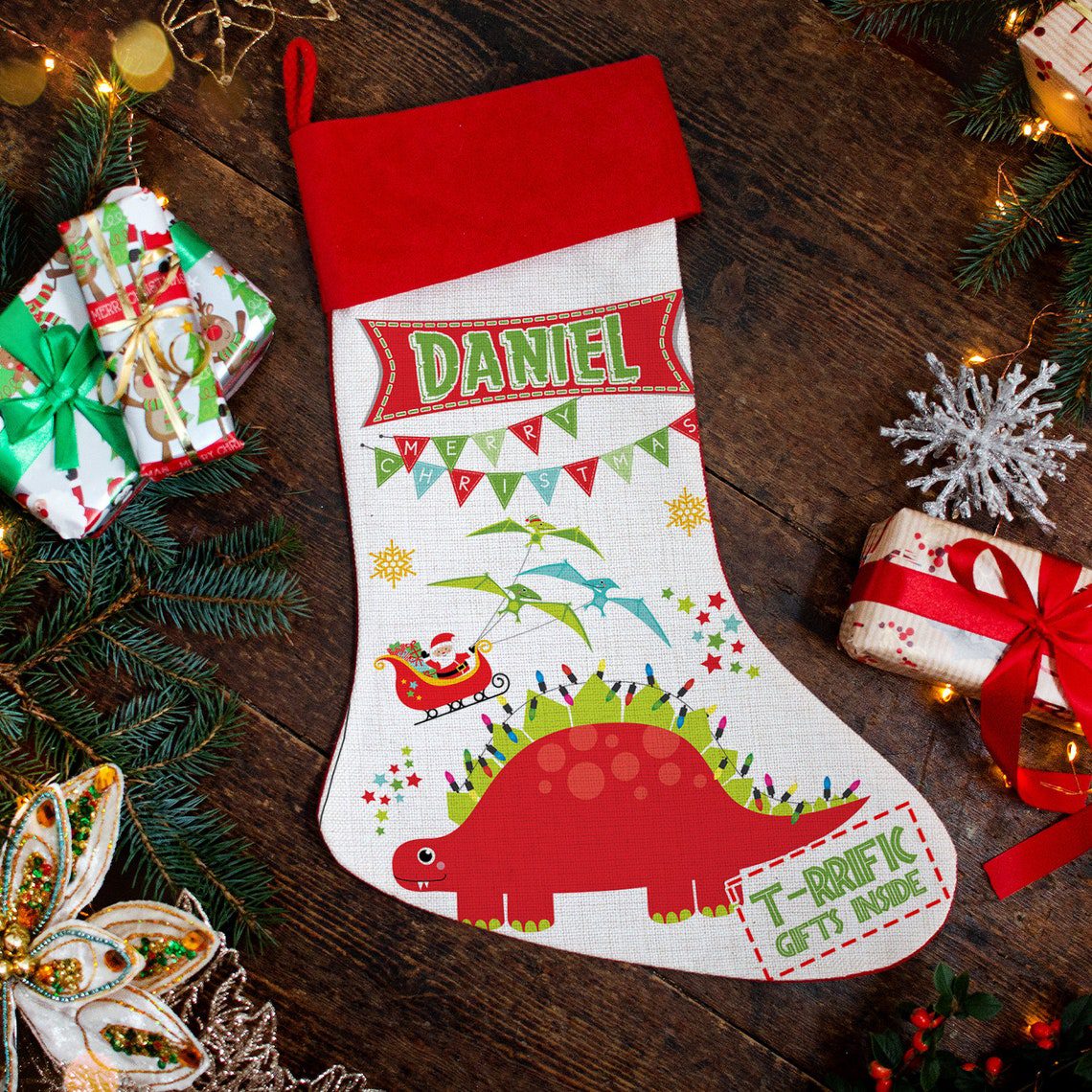 Personalised Dinosaur Christmas Stocking — great seasonal decor and perfect for holding festive treats!