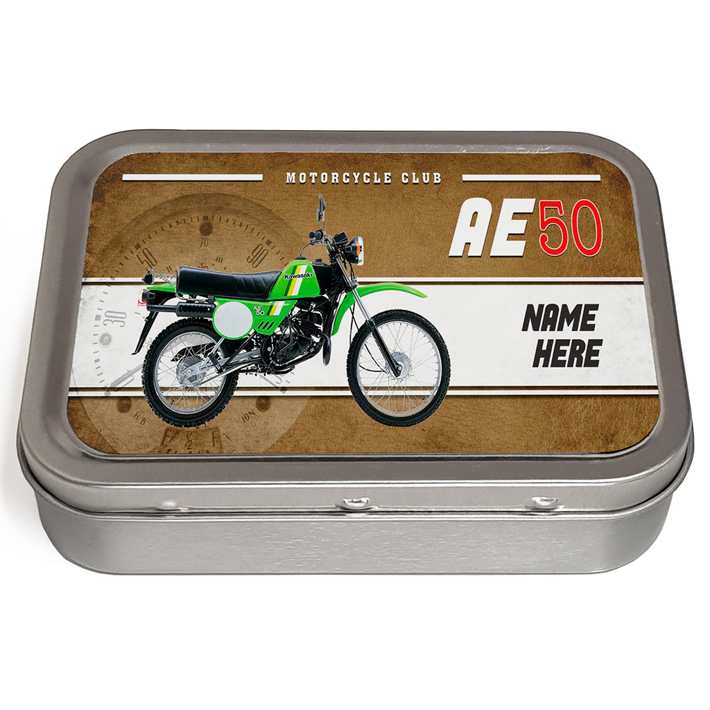 Classic Kawasaki AE 50 Motorcycle Tobacco Tin, the perfect retro men’s biker gift!