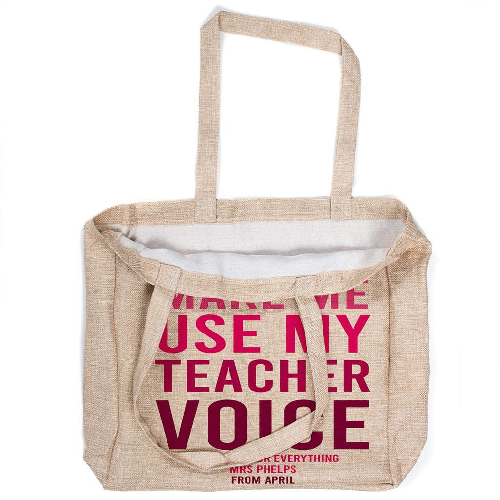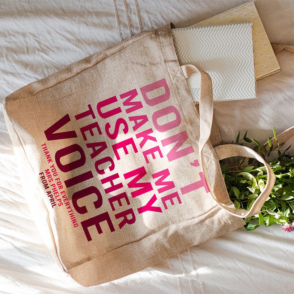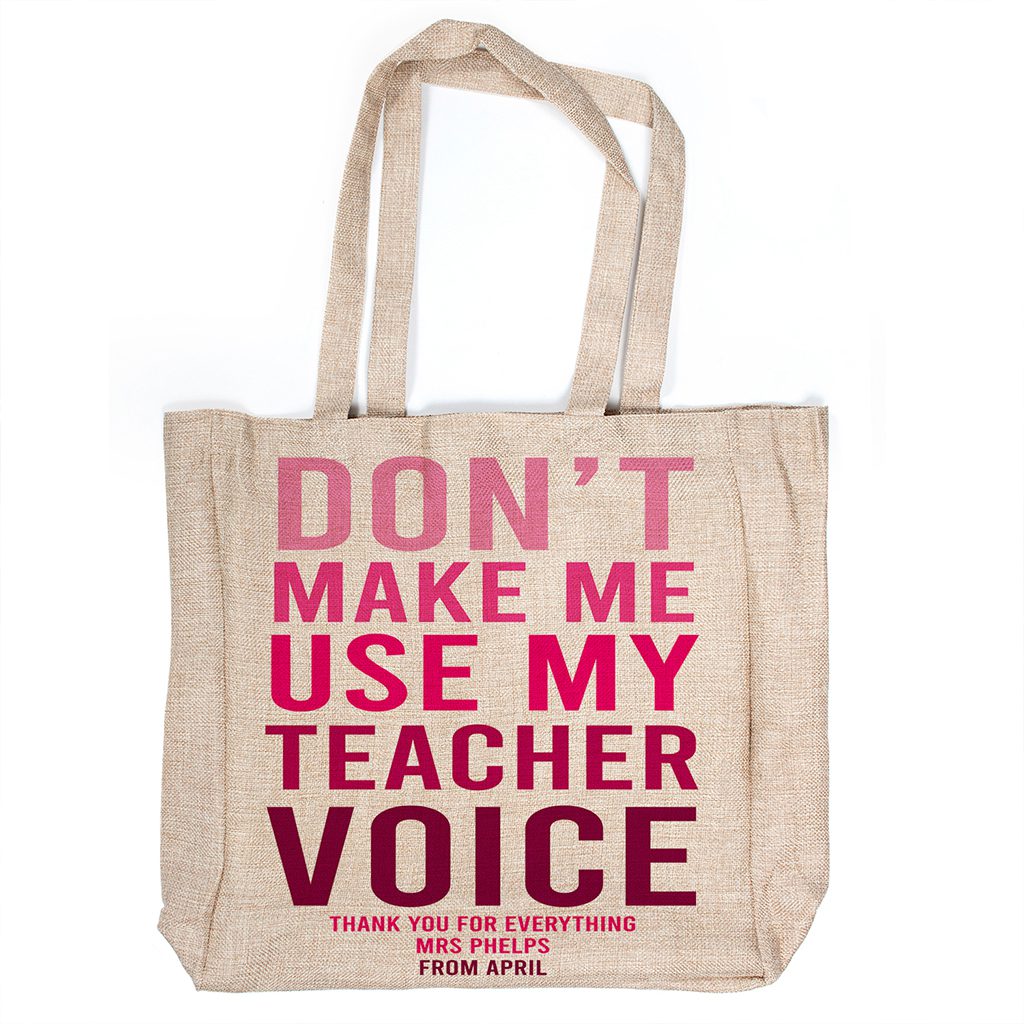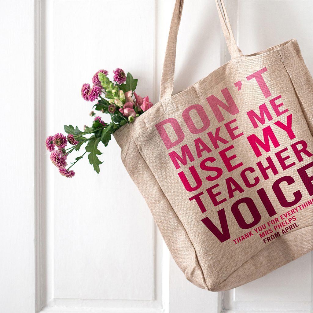 Personalised ‘Don’t Make Me Use My Teacher Voice’ Reusable Tote Bag, the perfect sustainable gift for any teacher!